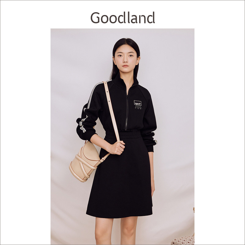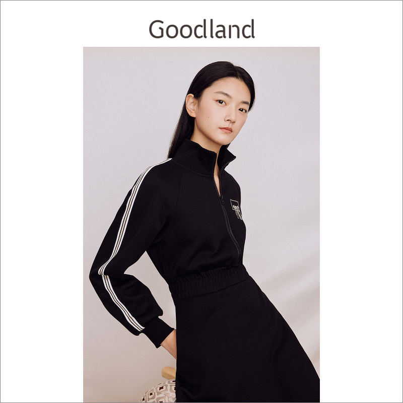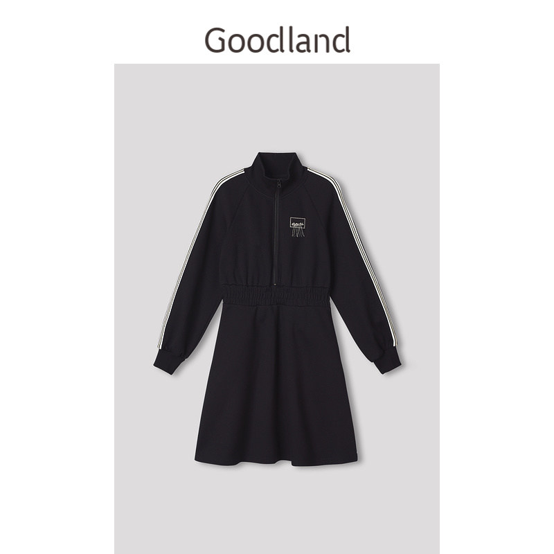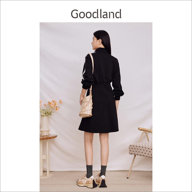 Goodland美地女装冬季立领针织收腰A摆运动风卫衣连衣裙