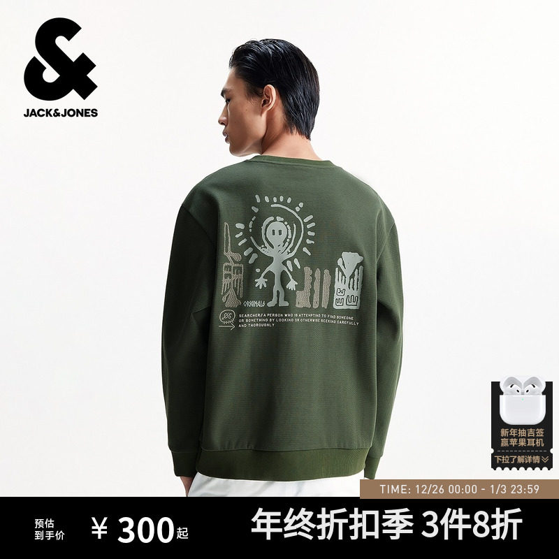 杰克琼斯男装秋冬新款字母刺绣图案胶印休闲华夫格落肩袖宽松卫衣