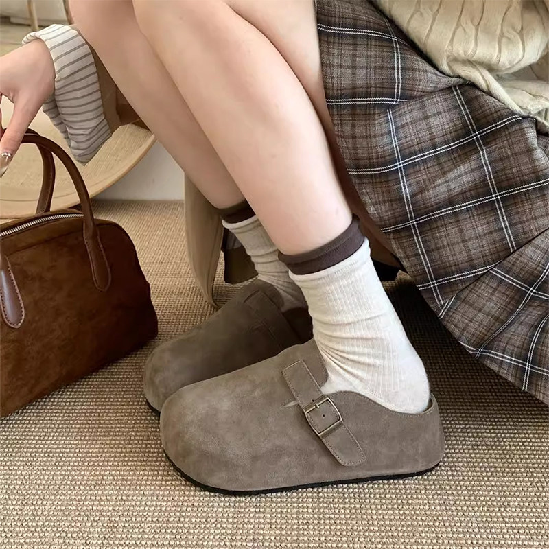 真皮包头拖秋季2025年新款勃肯鞋圆头拖鞋平底外穿休闲半拖懒人鞋