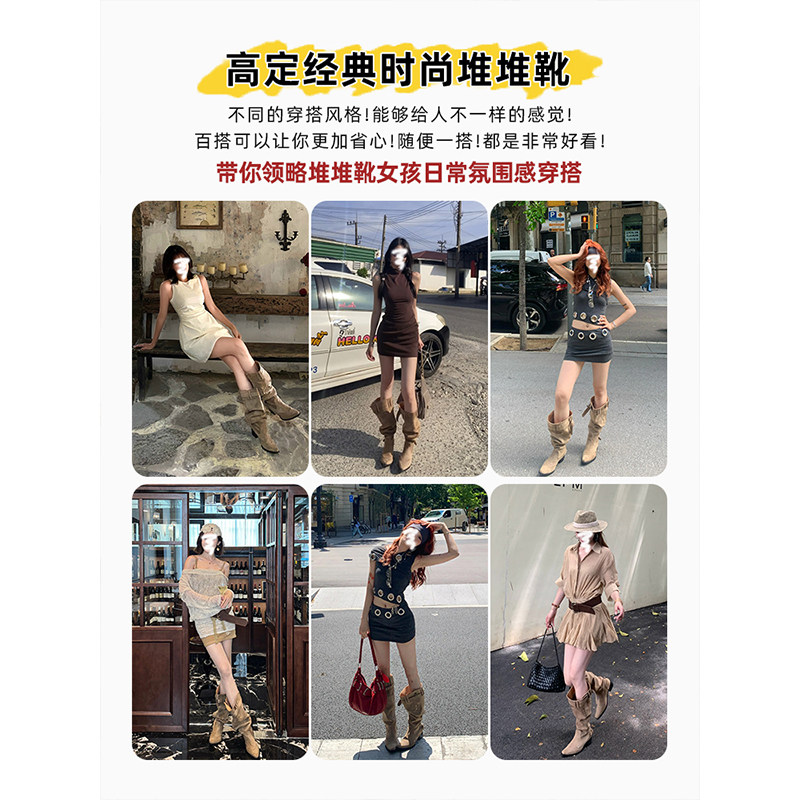 真皮~百搭辣妹风两穿长筒靴时尚尖头机车堆堆靴卡其色高筒粗跟