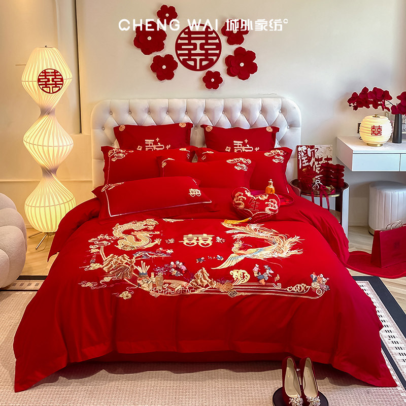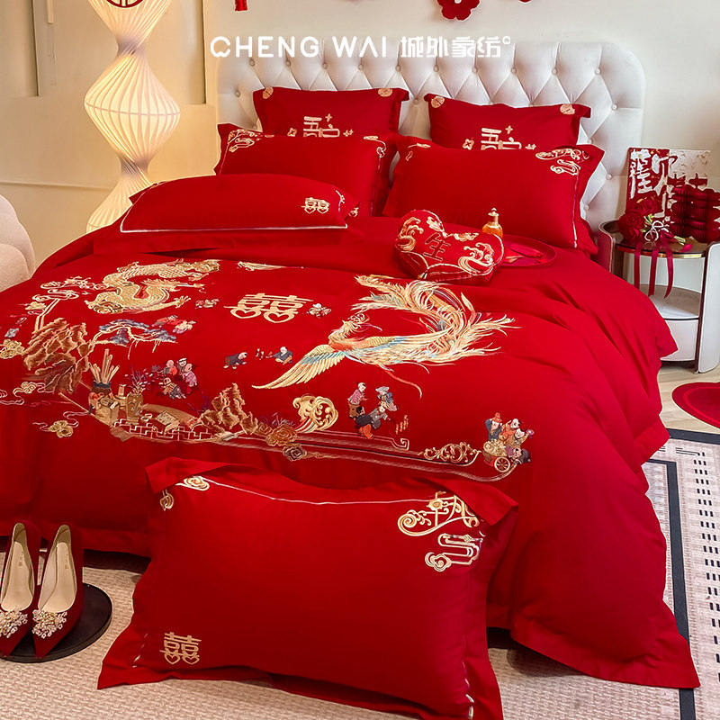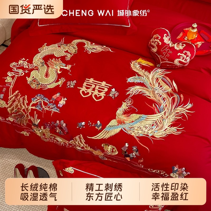 城外婚庆四件套全棉喜庆结婚龙凤床品刺绣喜被新婚大红中式套件