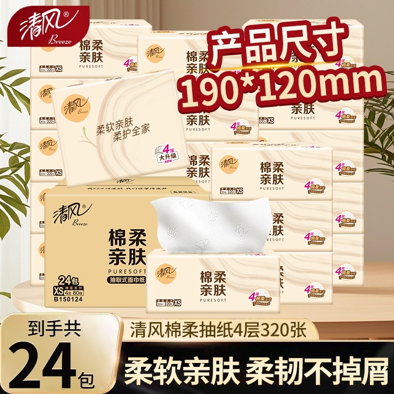 清风棉柔原木抽纸4层共320张24包纸巾整箱餐巾纸家用纸卫生纸by