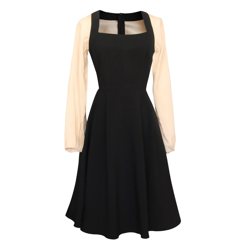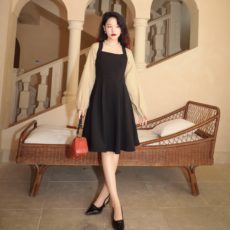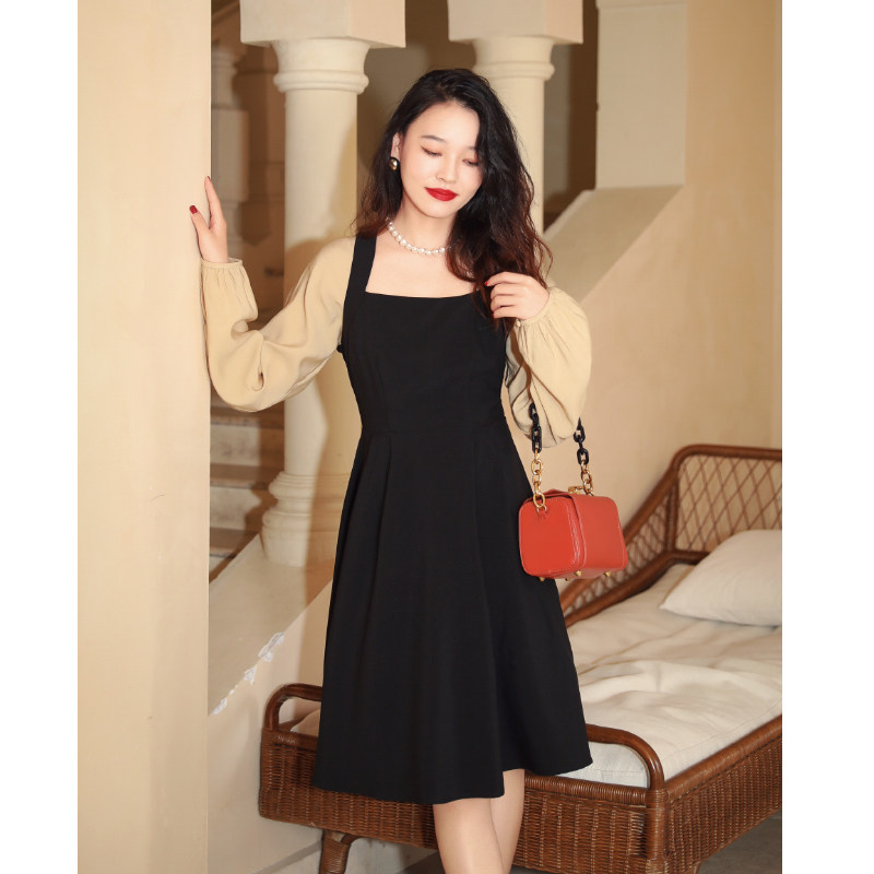 早春季茶歇小黑裙新款撞色拼接法式气质长袖裙黑色小个子连衣裙女