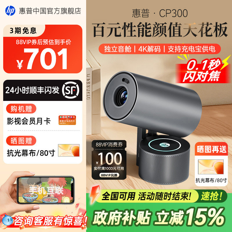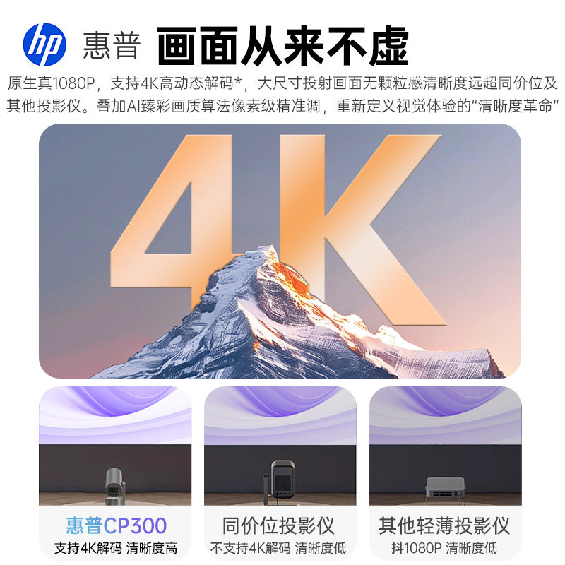 【全国政府补贴立减15%】HP惠普CP300投影仪无需幕布家用超高清家庭卧室投墙可连手机投屏器小型投影机宿舍