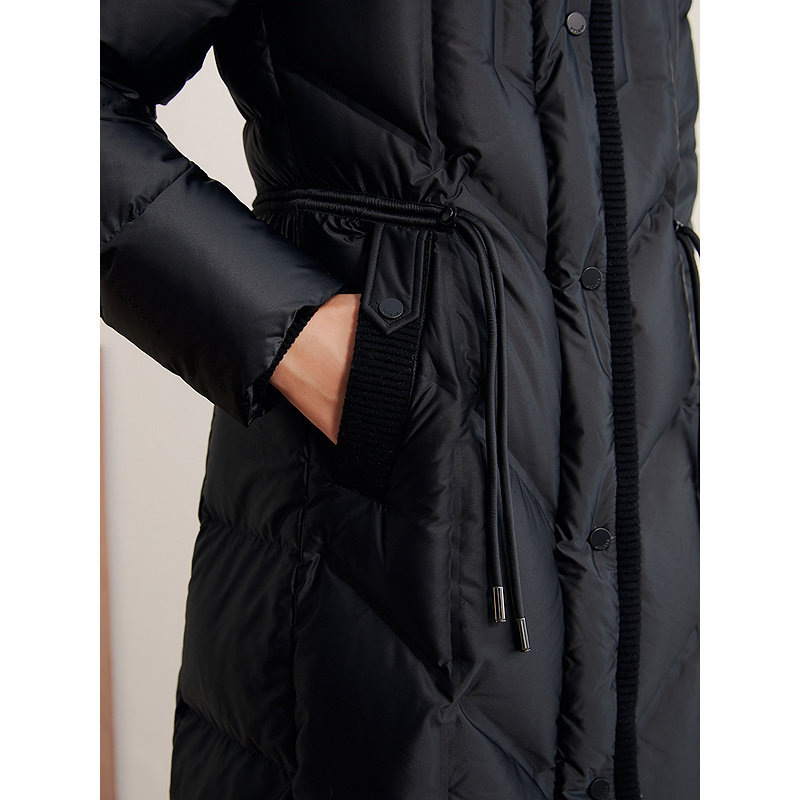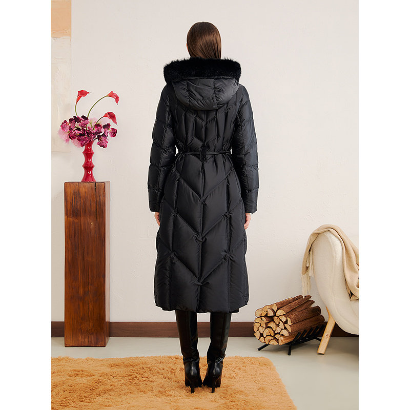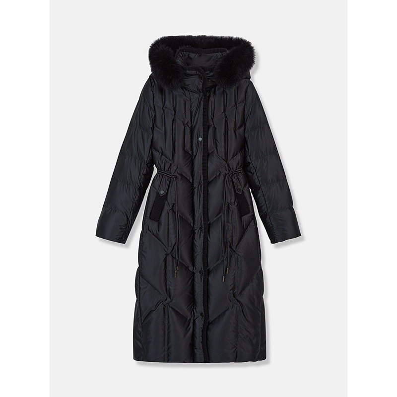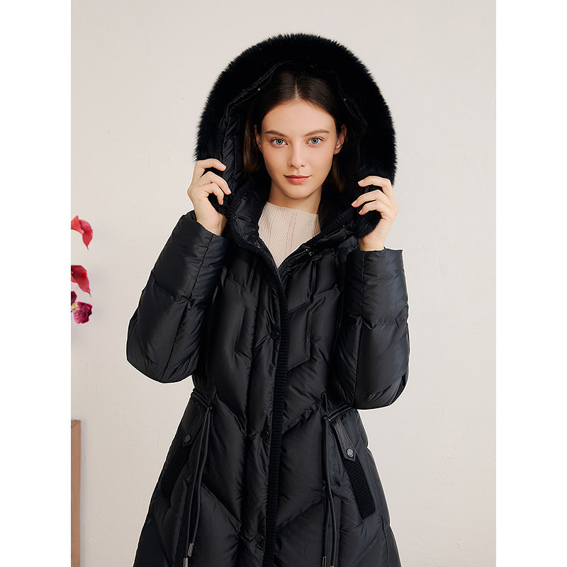 YINER音儿专选2025冬季新款法式柔光缎面狐狸毛领连帽长款羽绒服