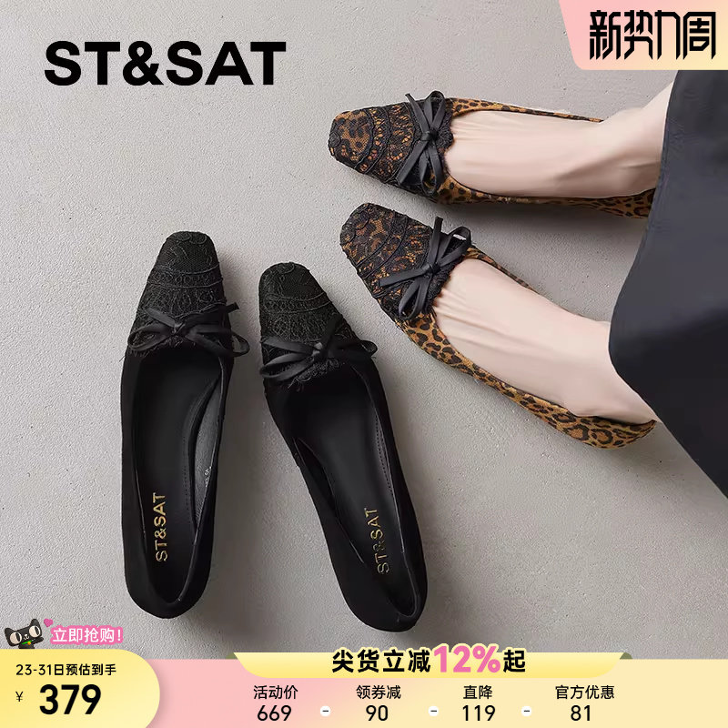 星期六豹纹时装鞋女2025新款方头粗跟平底单鞋性感浅口蝴蝶结女鞋