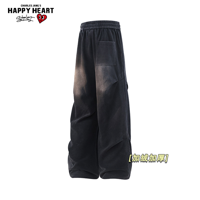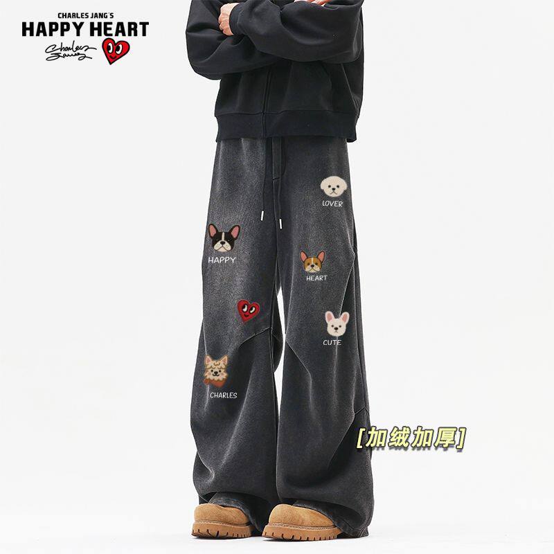 查尔斯桃心褶皱渐变小狗印花加绒加厚直筒裤子男女冬季新款长裤潮
