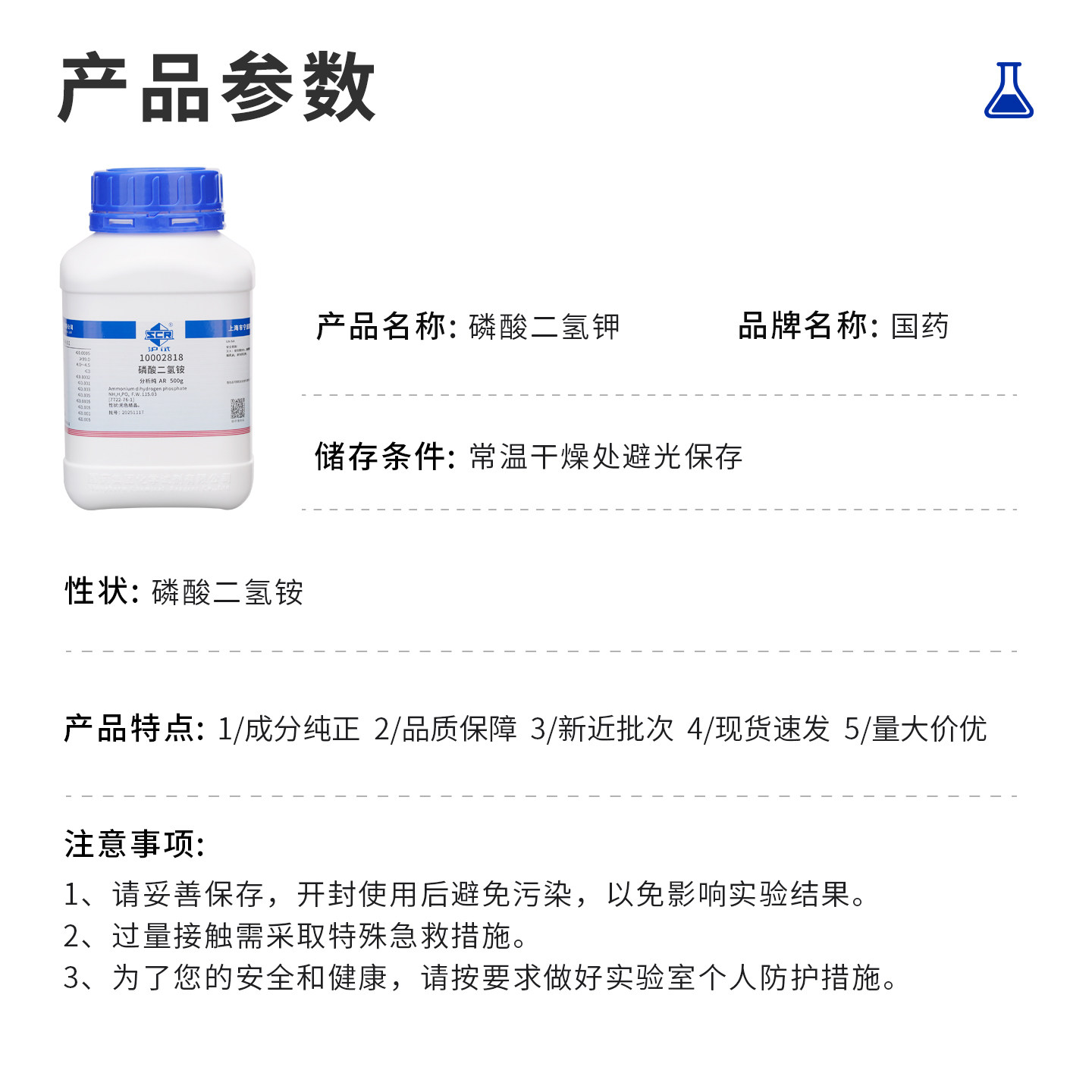 国药二氢铵 沪试磷酸AR分析纯实验室专用试剂磷酸铵化学调节剂500g/瓶