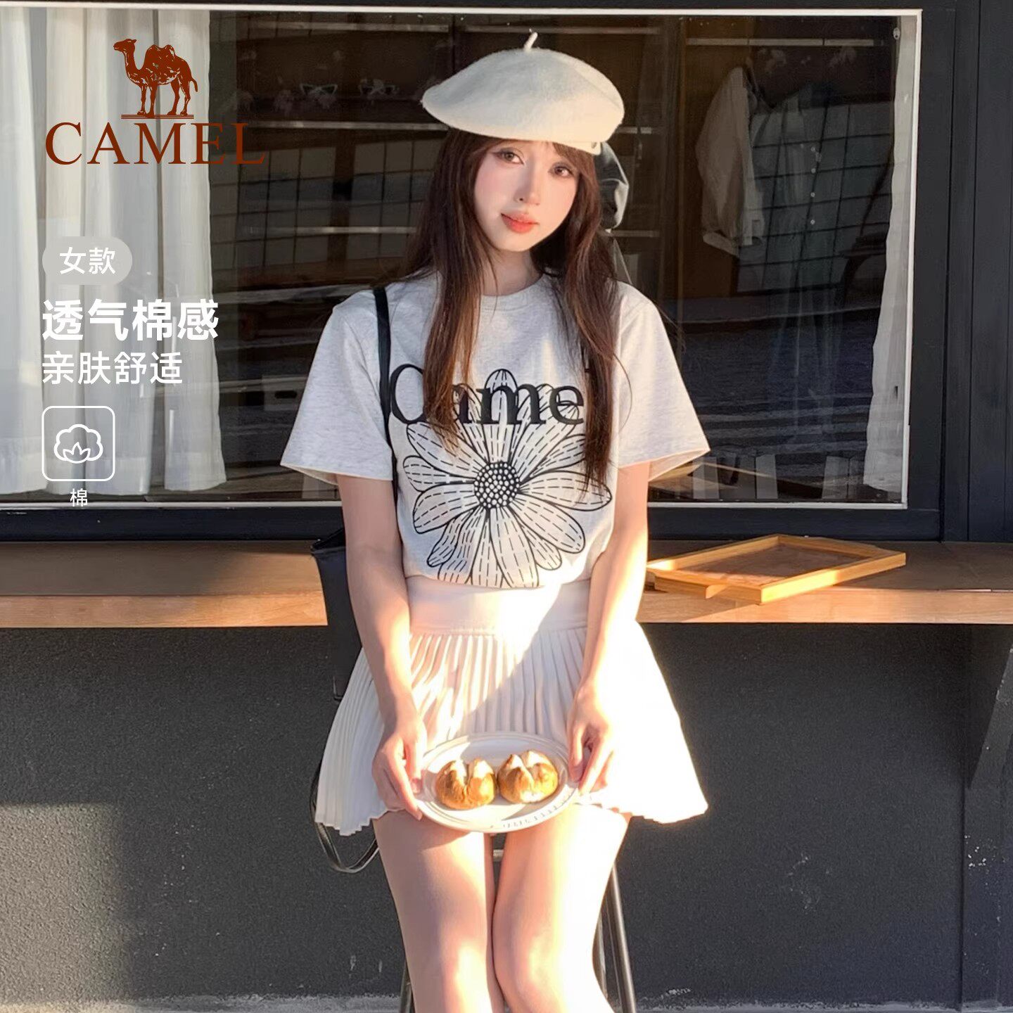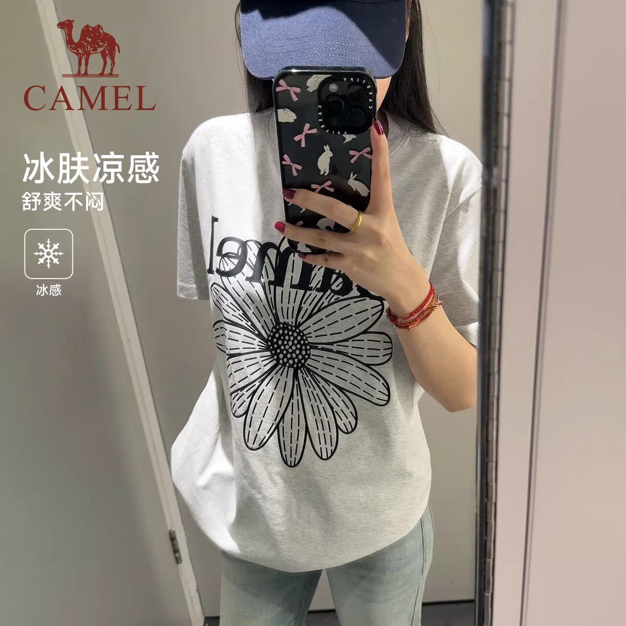 骆驼冰皮T神女小雏菊T恤短袖夏季棉感休闲韩系圆领学生运动上衣潮