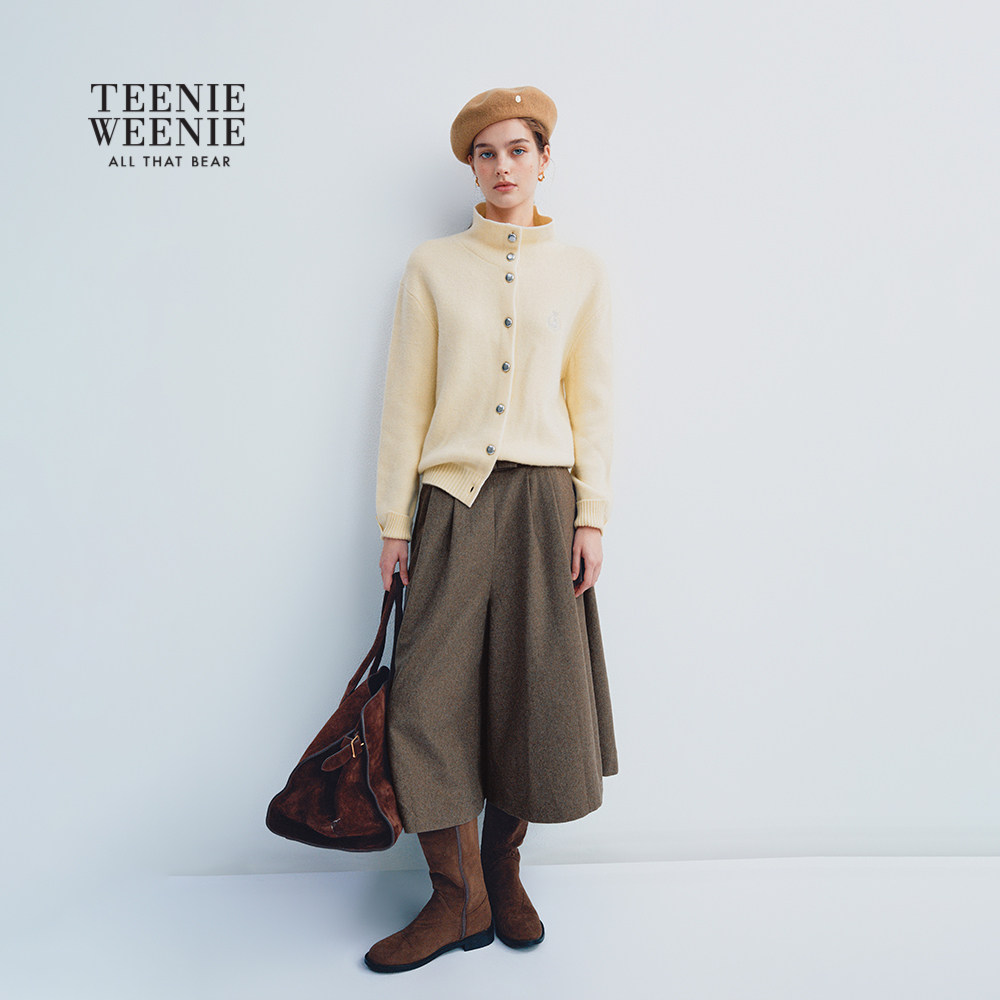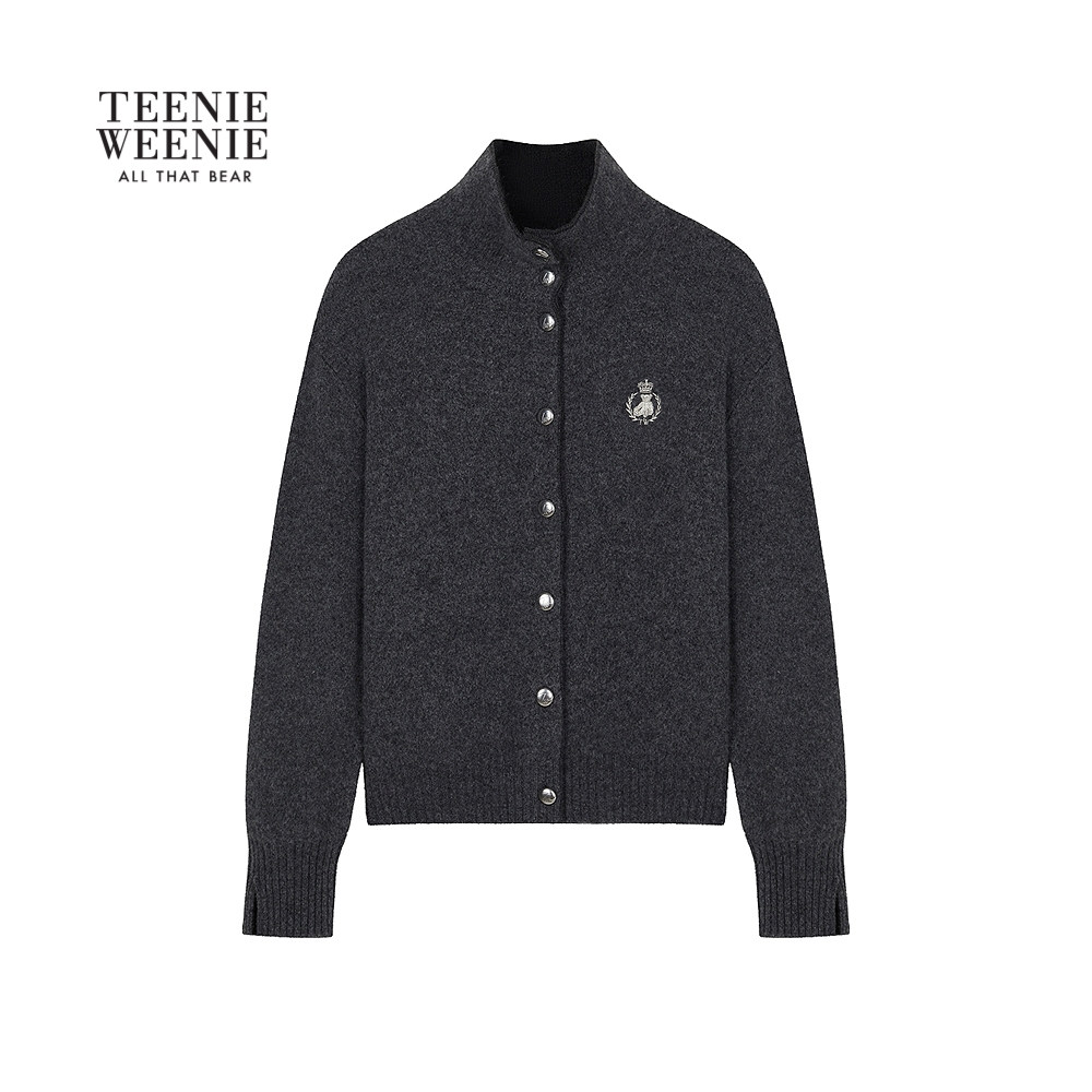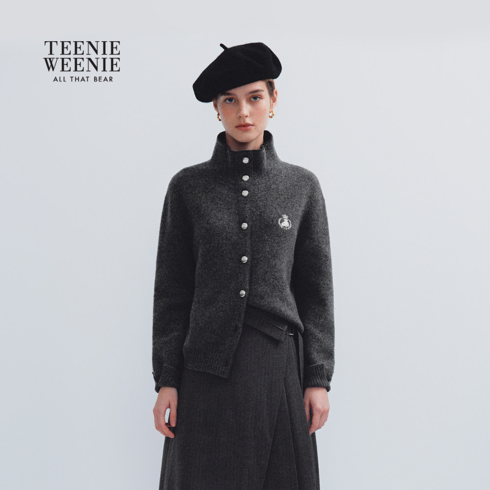 TeenieWeenie小熊女绵羊毛针织开衫2025冬新款外套式立领毛衣开衫