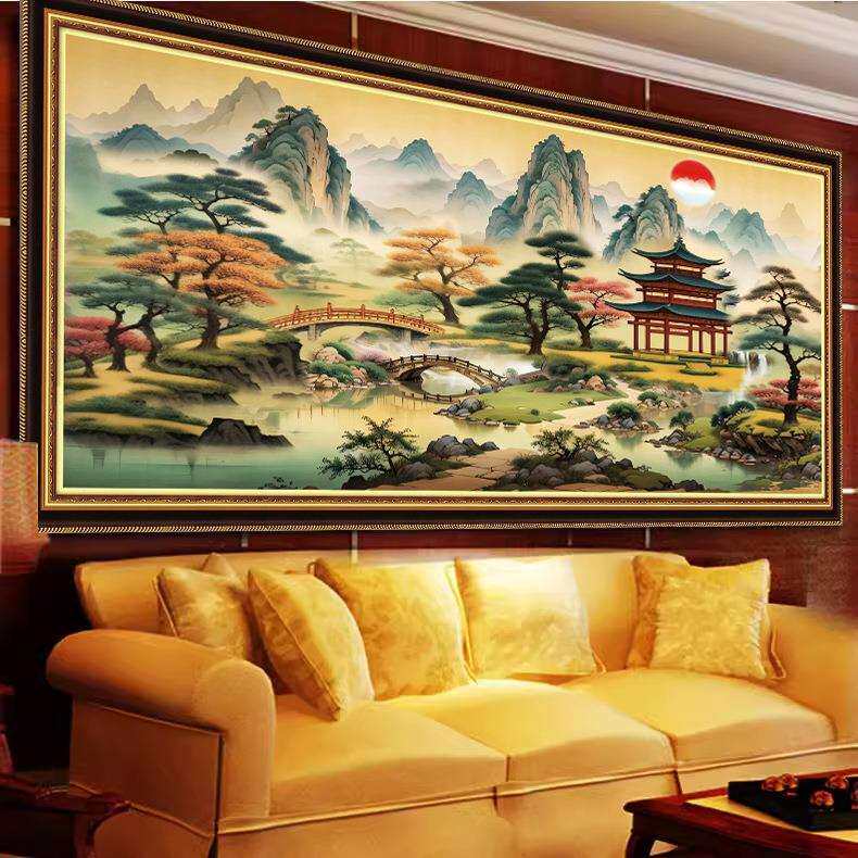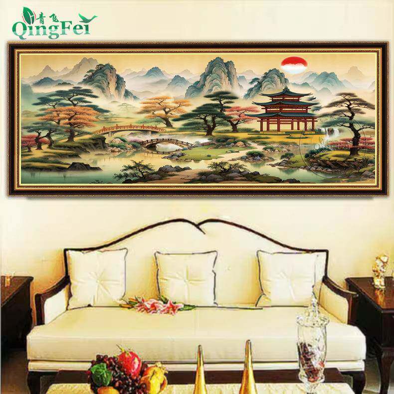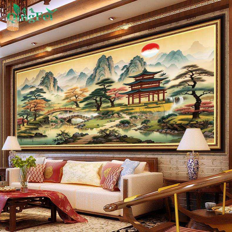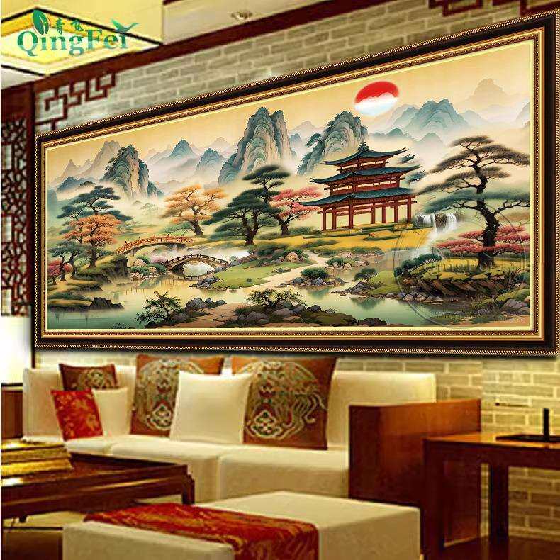 青飞精准印布亭台楼阁十字绣款中式线绣客厅山水画中国风手工刺绣