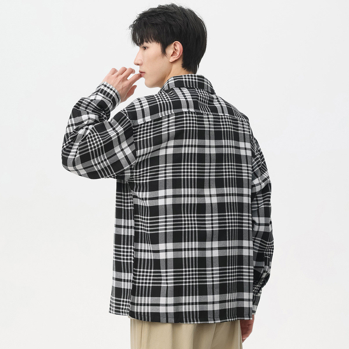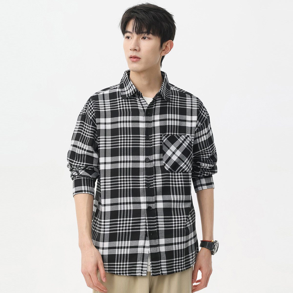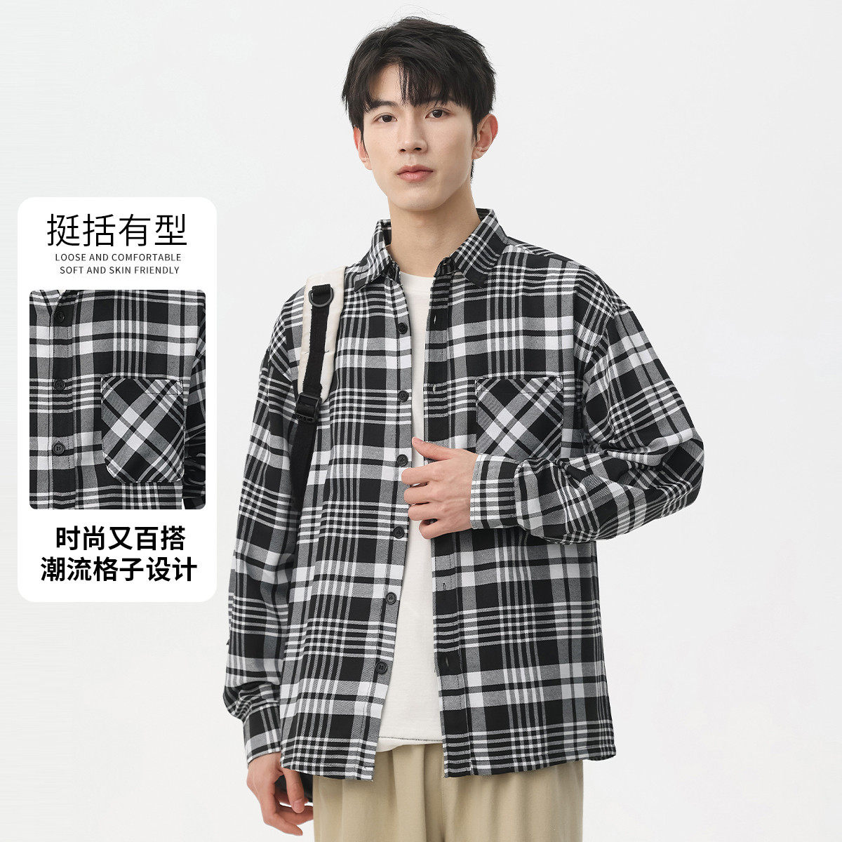 啄木鸟秋季新款男士长袖100%全纯棉磨毛格子衬衫 高级感休闲衬衣
