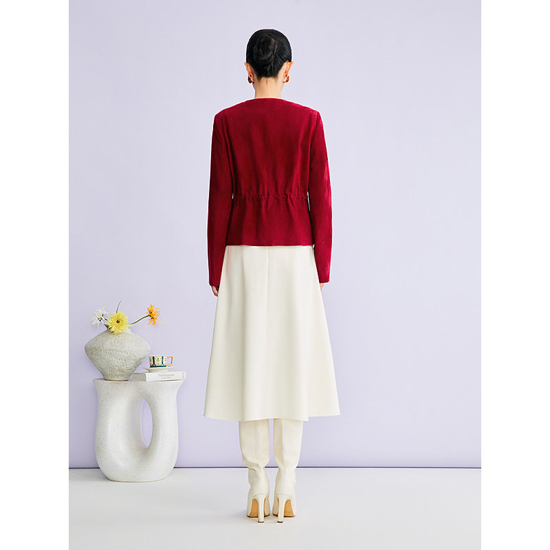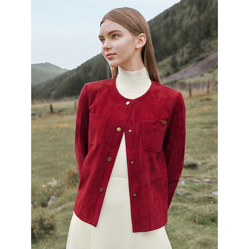 YINER音儿2026春季新款时尚简约短款圆领反绒羊皮真皮皮衣夹克