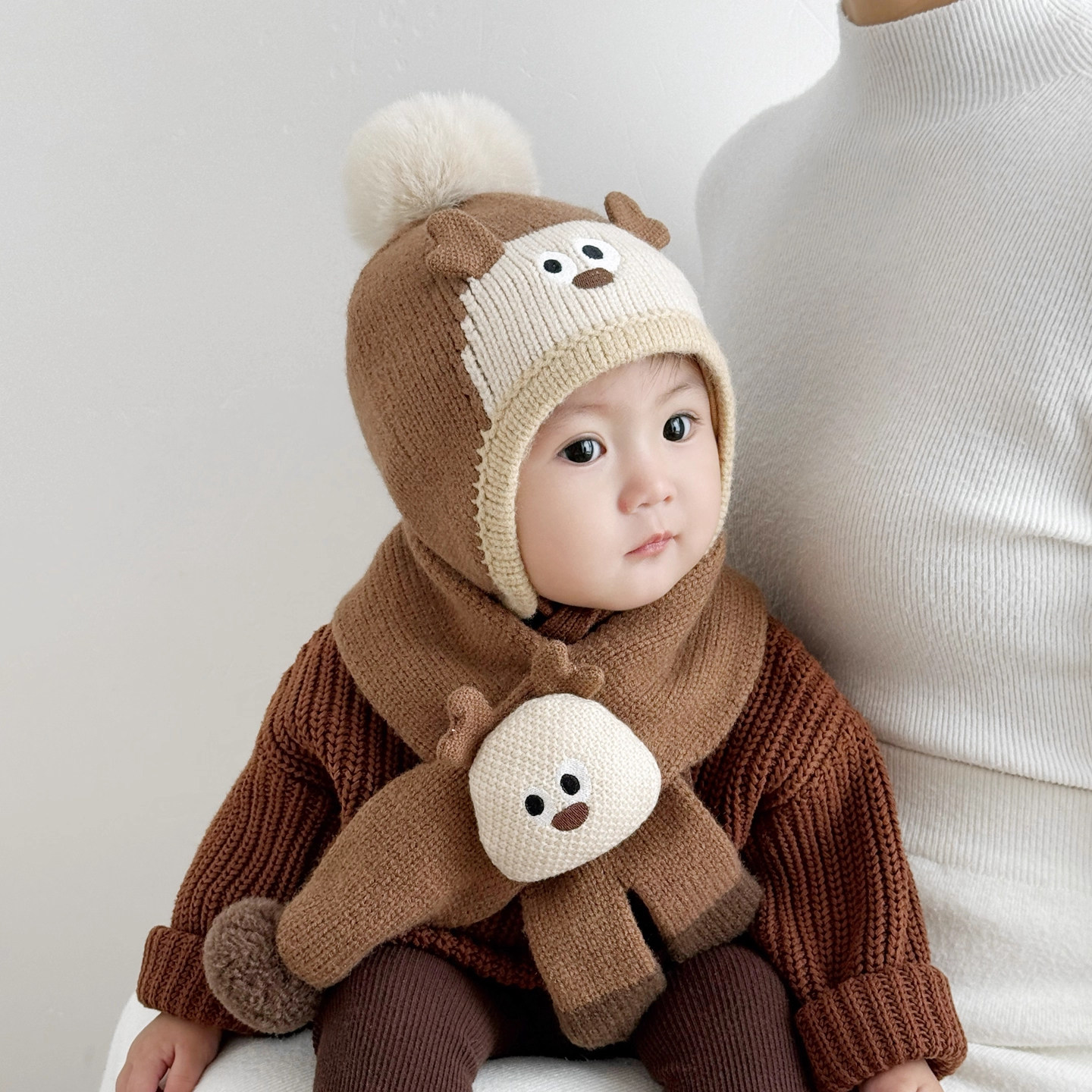 尼多熊婴儿帽子秋围脖一体宝宝毛绒帽防风护耳帽冬季保暖婴幼儿帽
