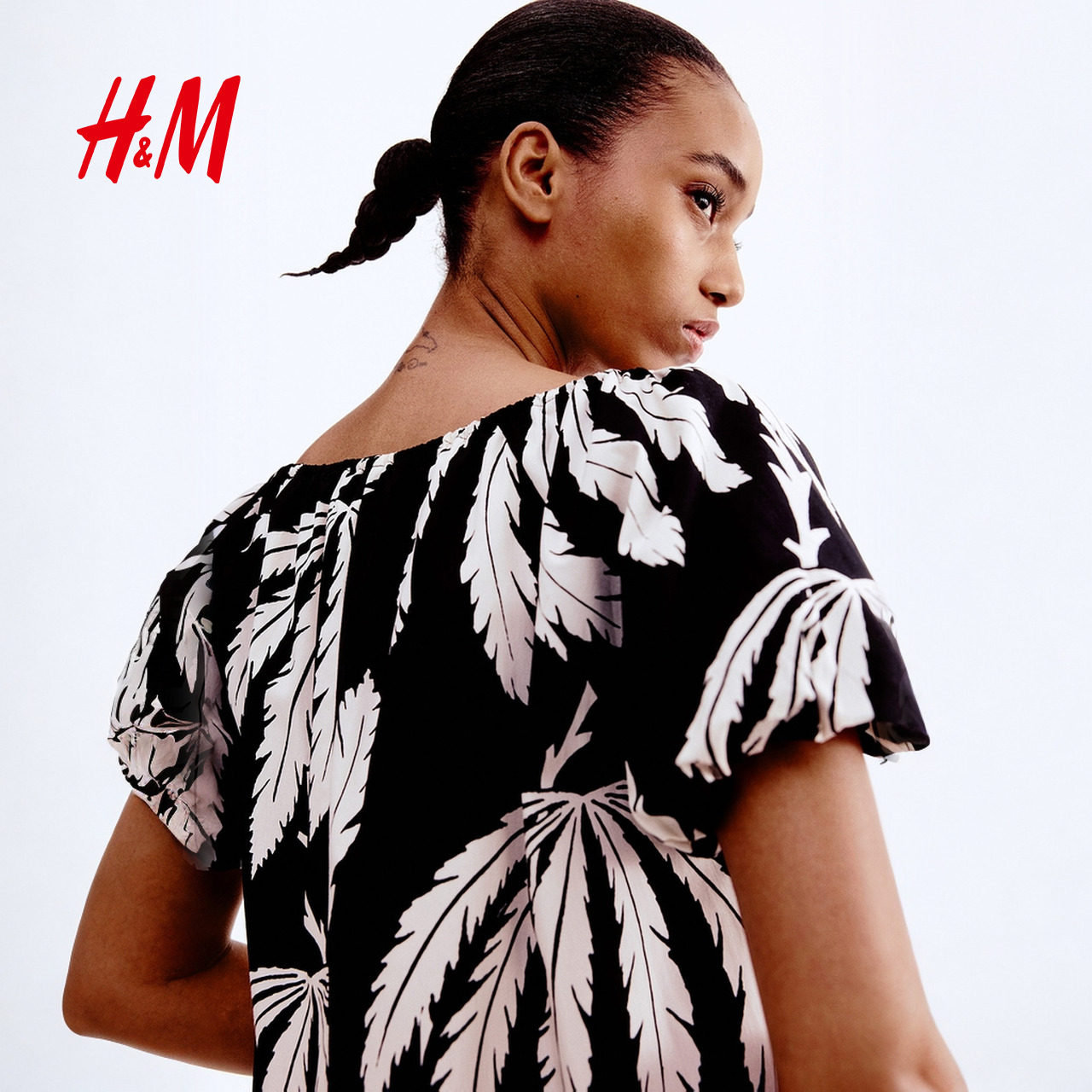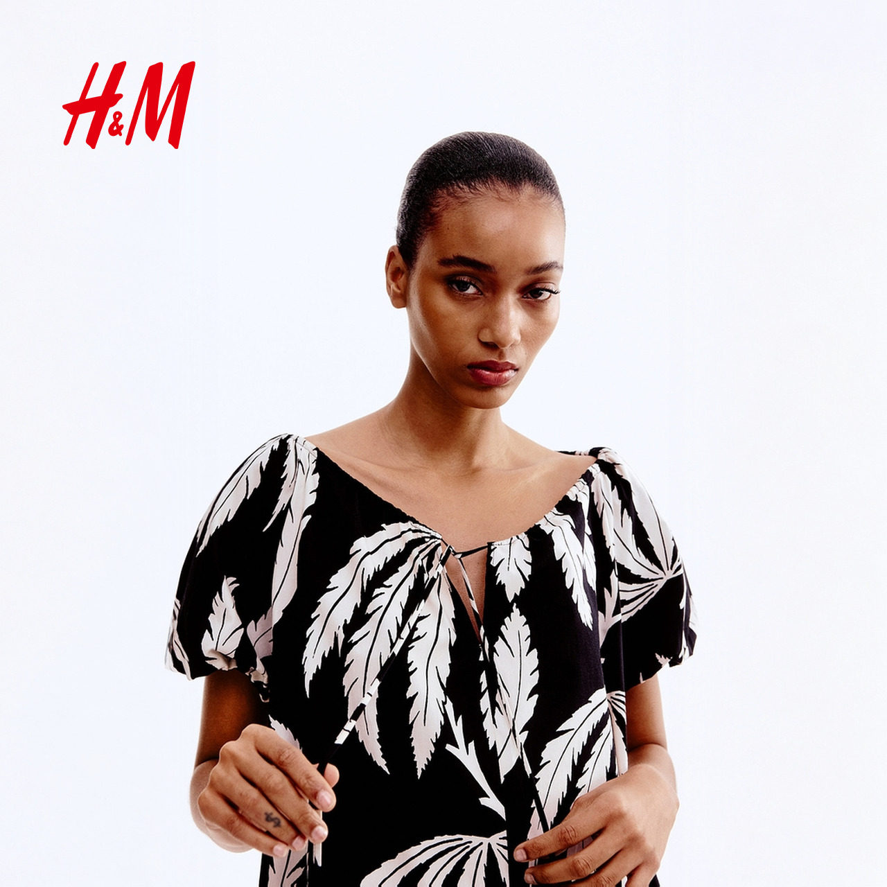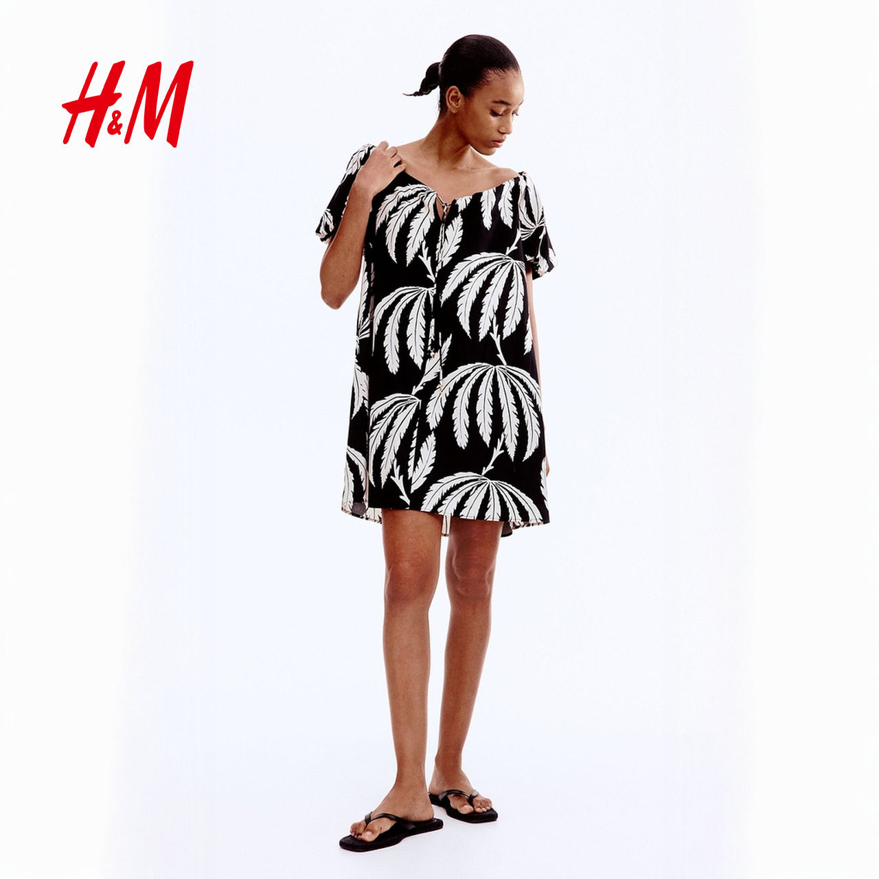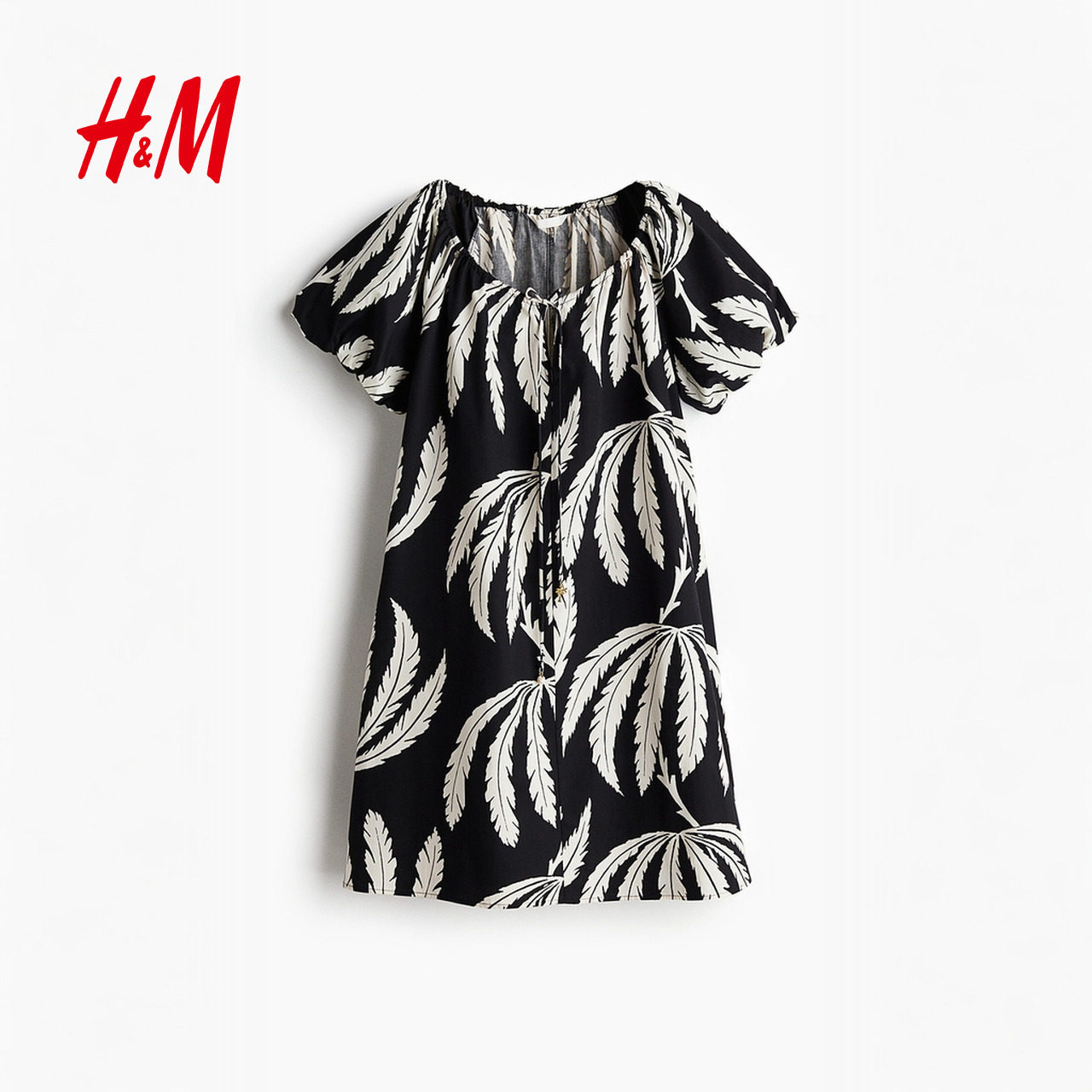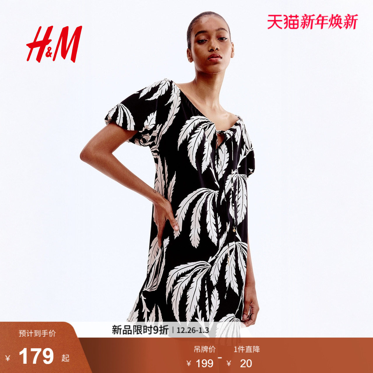 HM女装无领连衣裙2025冬季新款宽松A字抽绳领设计感碎花裙1275760