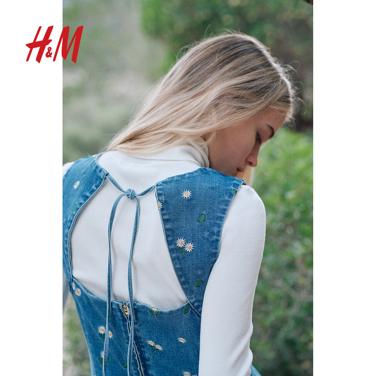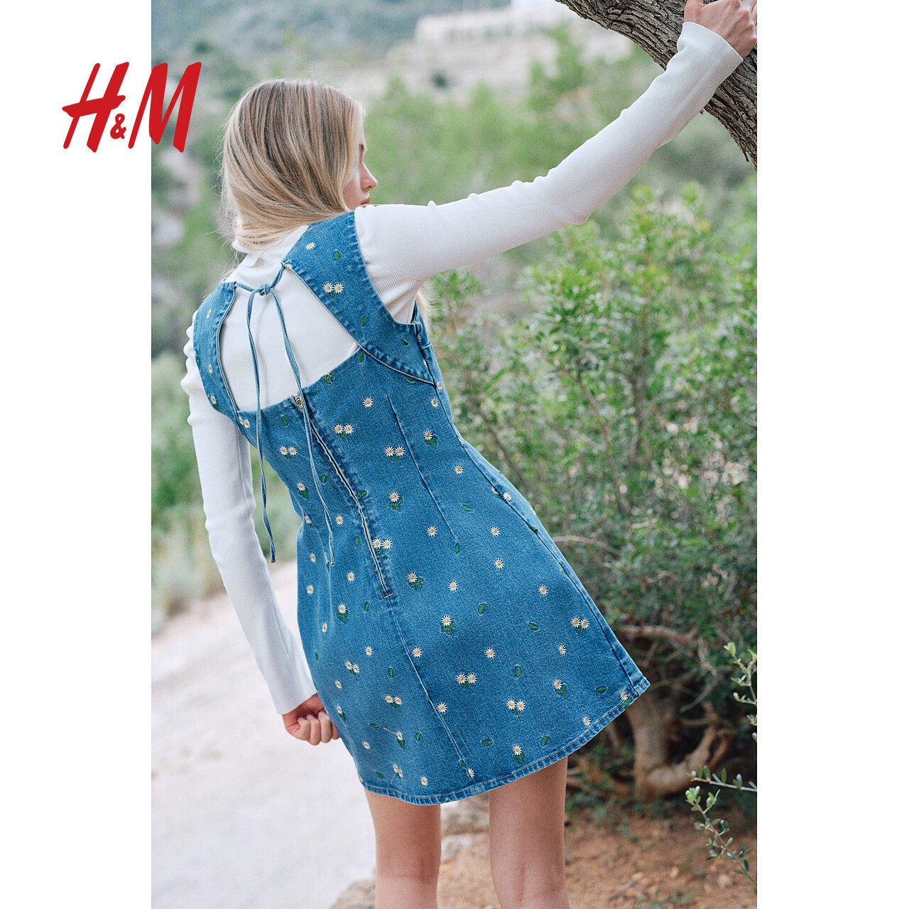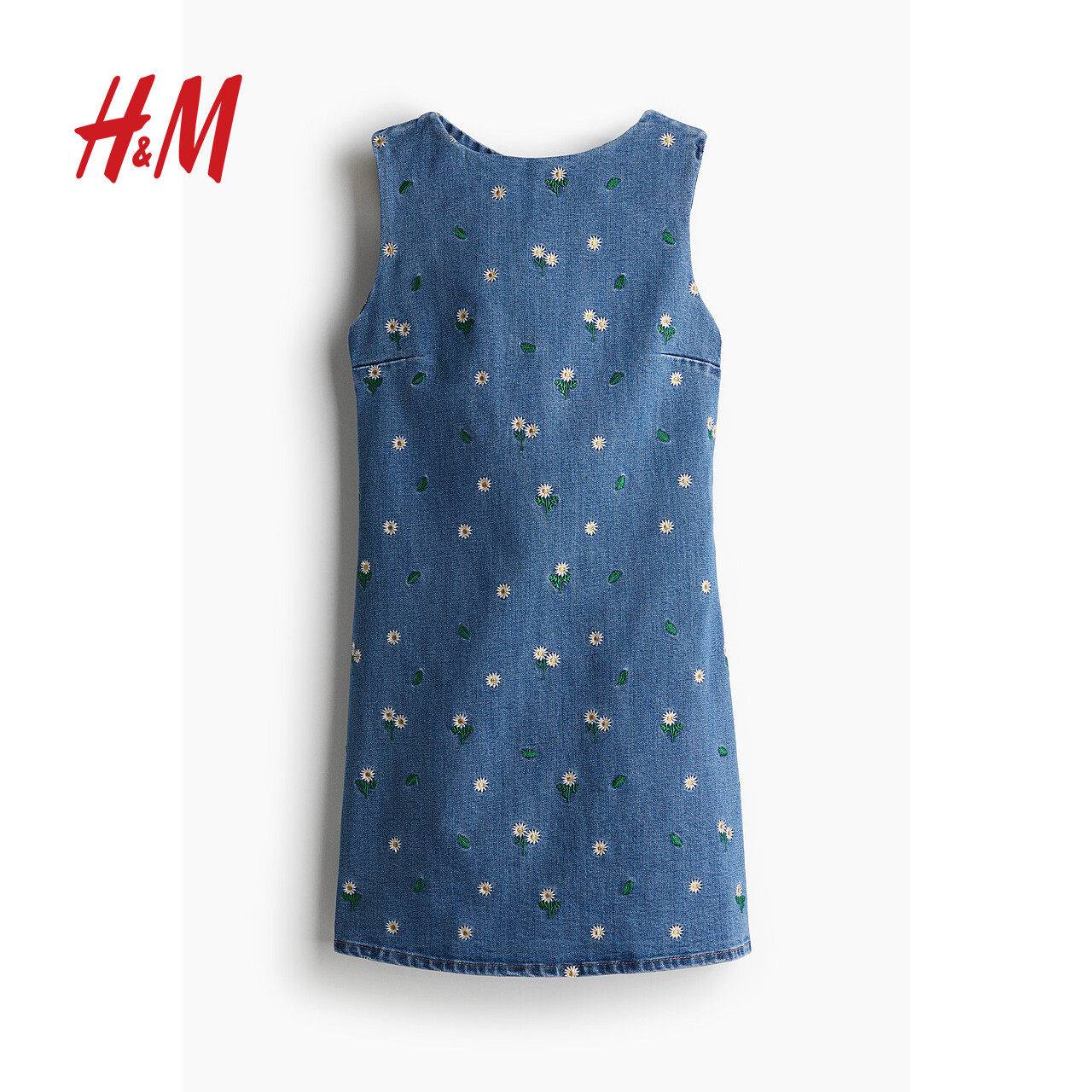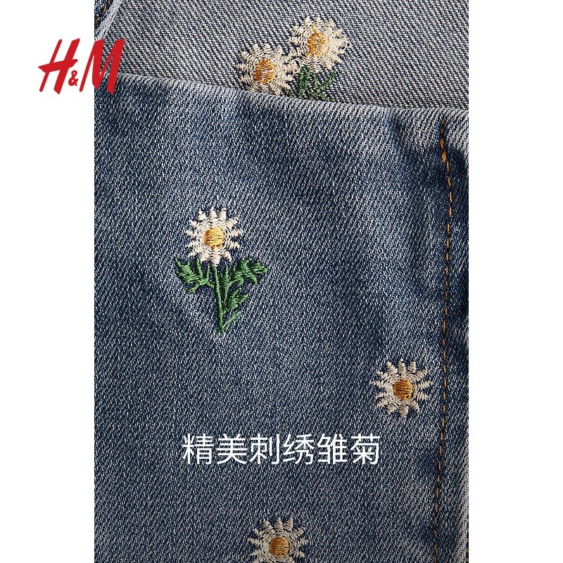 HM女装连衣裙2025冬季新款牛仔刺绣露背短款设计感碎花裙1282227