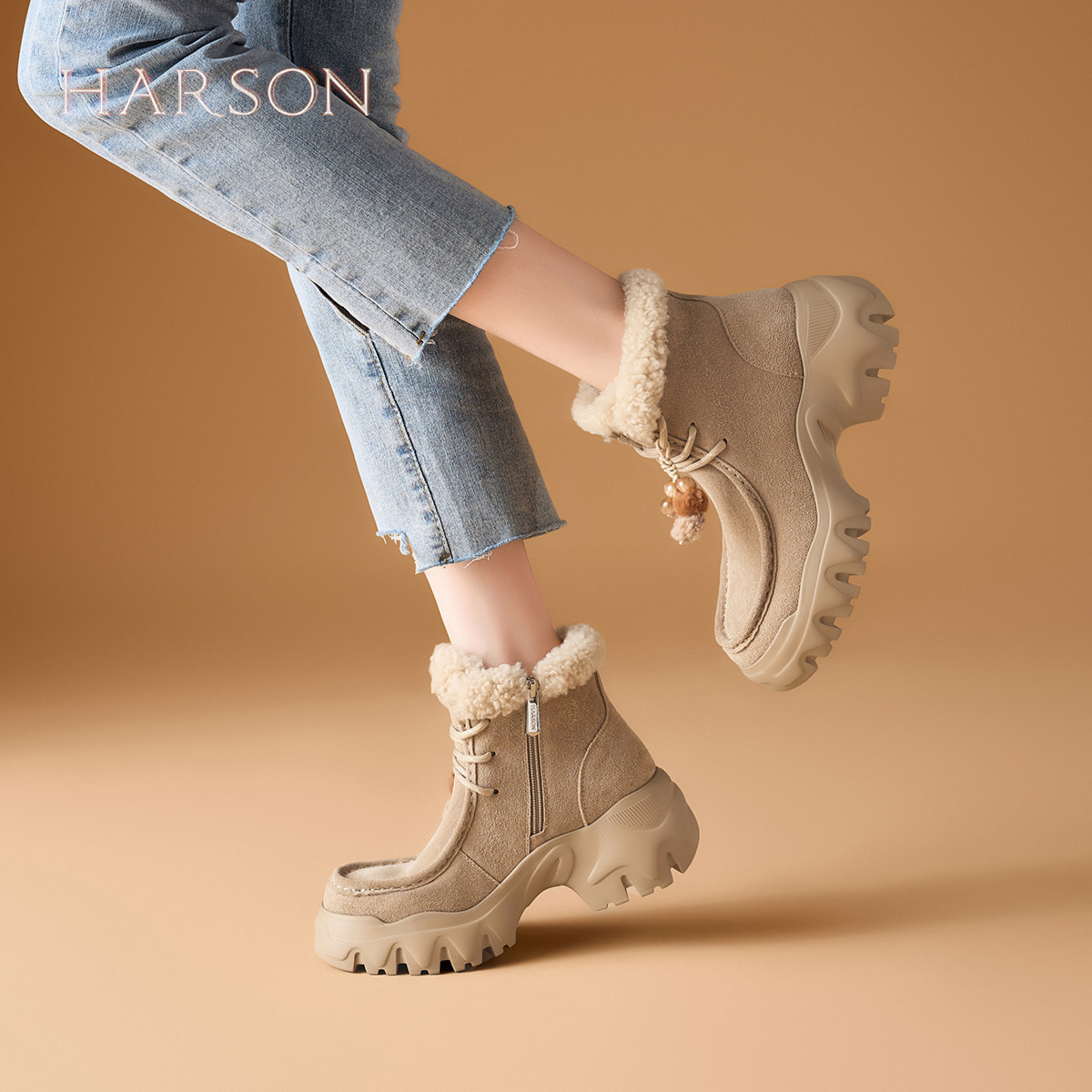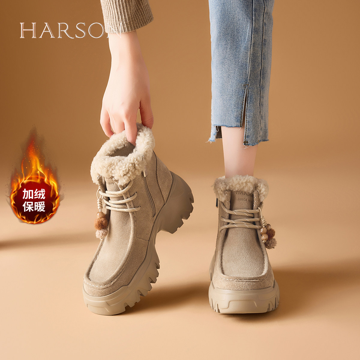 哈森加绒保暖羊毛口雪地靴女鞋子2025冬季新款厚底休闲棉鞋运动靴