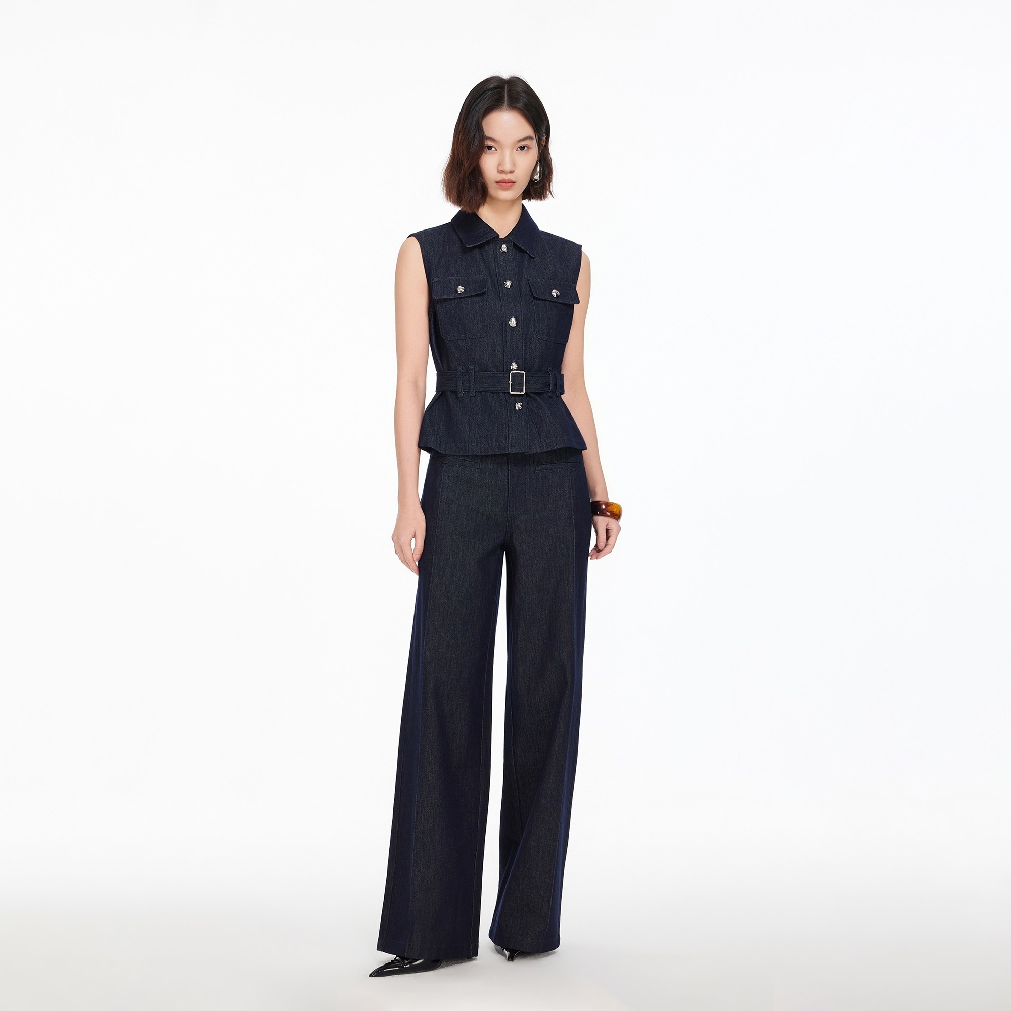 丹宁牛仔面料,挺括复古。 无袖衬衫版型