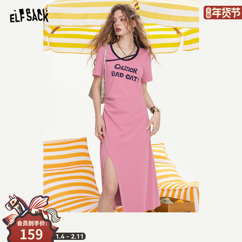 妖精的口袋字母印花收腰抽褶连衣裙女2025夏季新款开叉休闲t恤裙