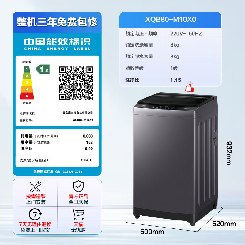 海尔波轮洗衣机大神童8公斤全自动一级能效家用宿舍1.15超净洗