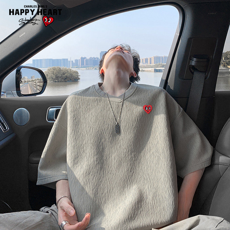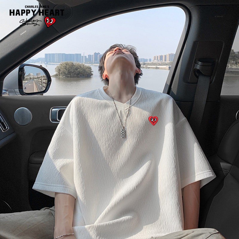 查尔斯桃心复古纯色cleanfit短袖t恤男夏季新款潮牌肌理感V领半袖