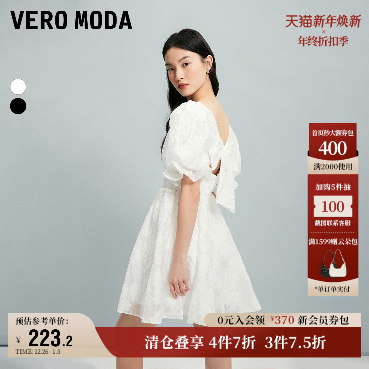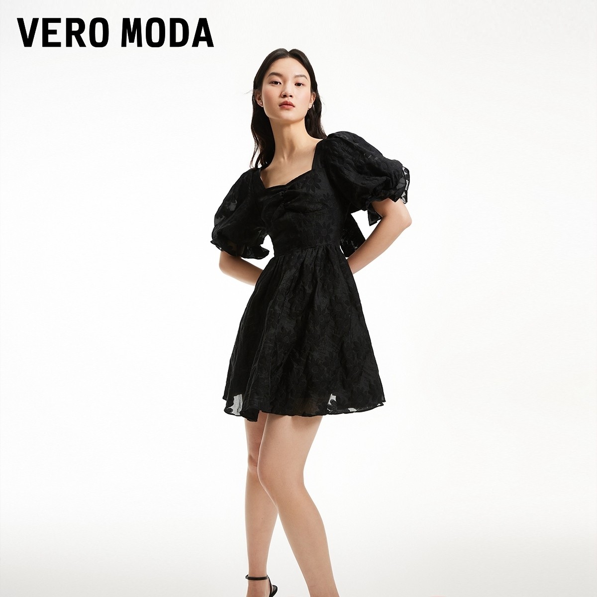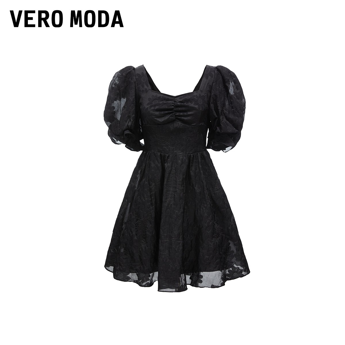 Vero Moda奥莱连衣裙夏季新款方领五分泡泡袖花朵收腰高级短裙子