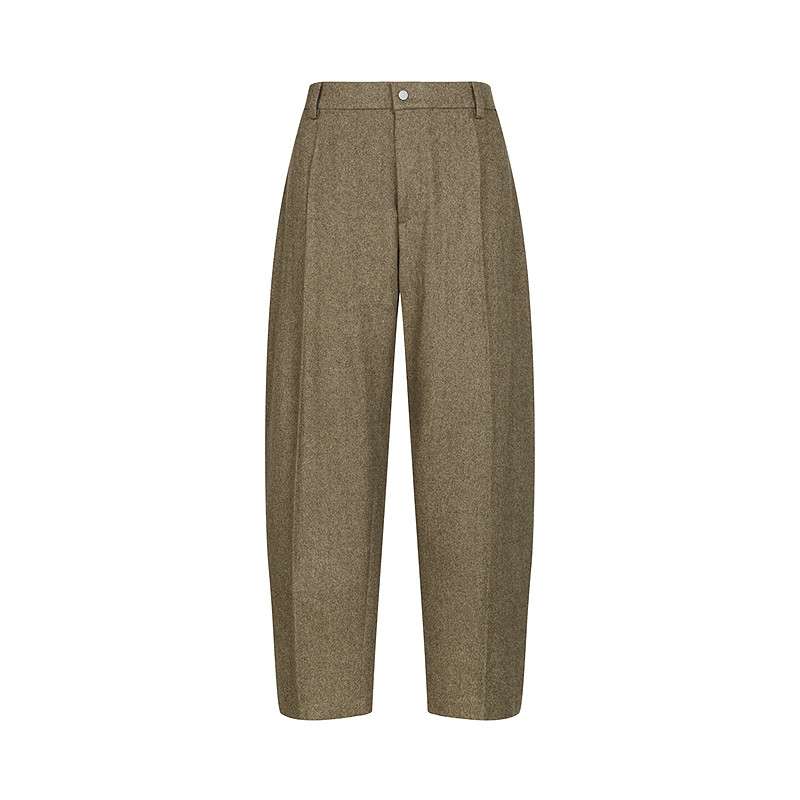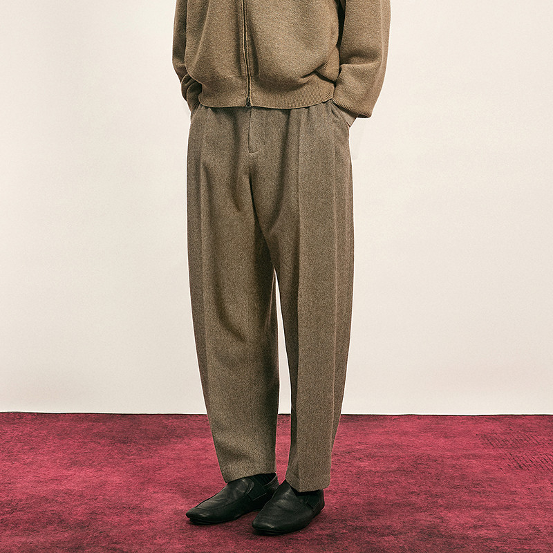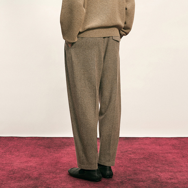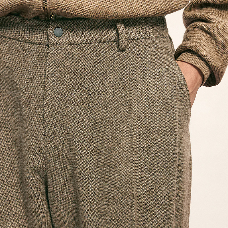 羊毛粗纺斜纹呢,裤腿处微收干净利落