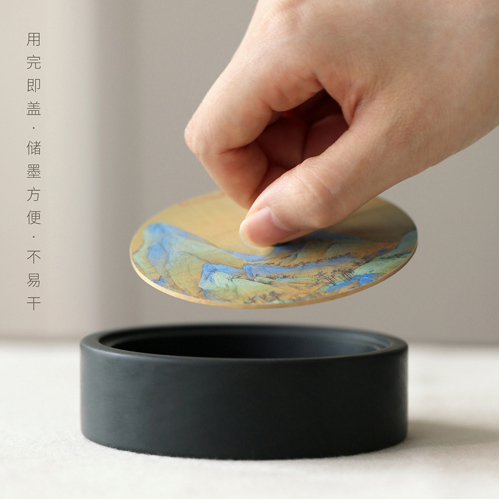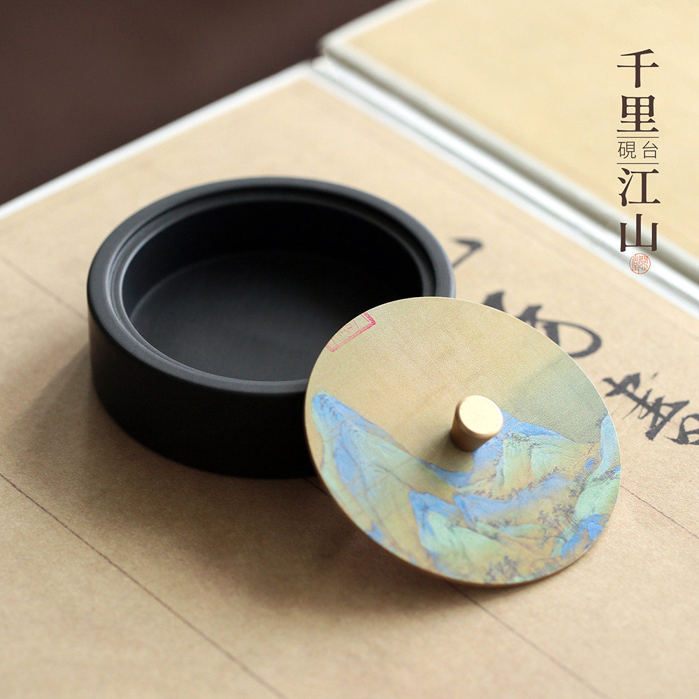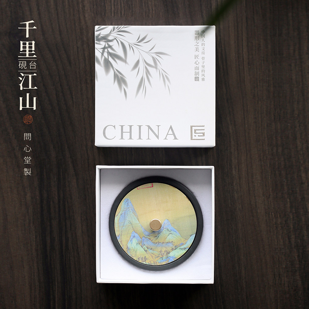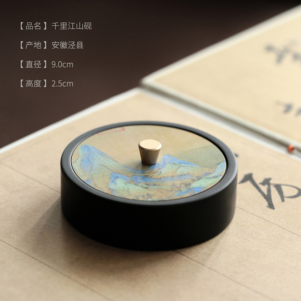 问心堂千里江山砚台墨盒玉山罗纹砚石带盖天然水波纹砚台文房四宝