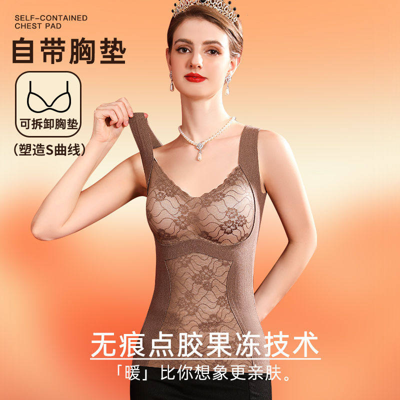 德绒保暖女士内衣塑身美体免穿文胸背心加绒加厚蕾丝红色桑蚕丝