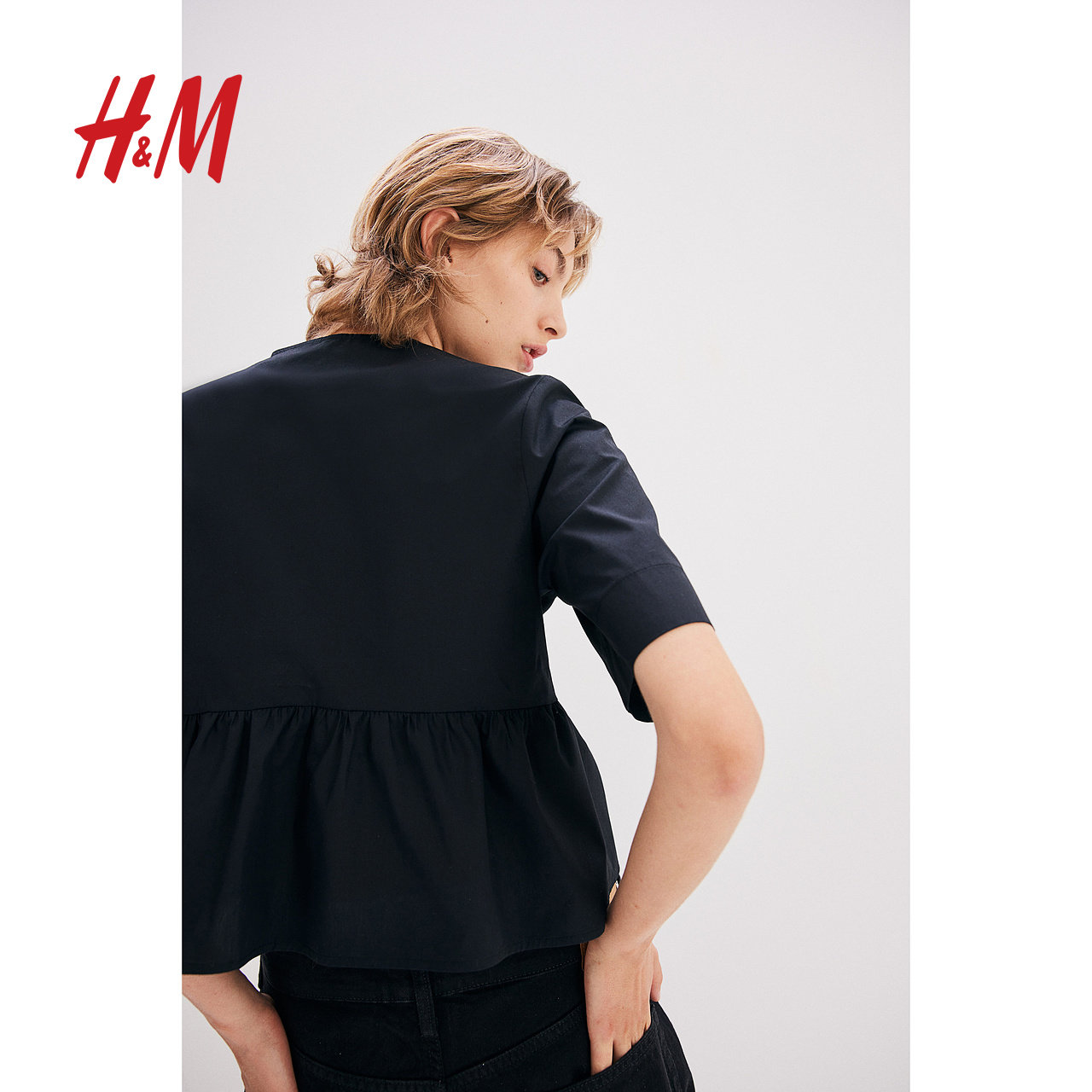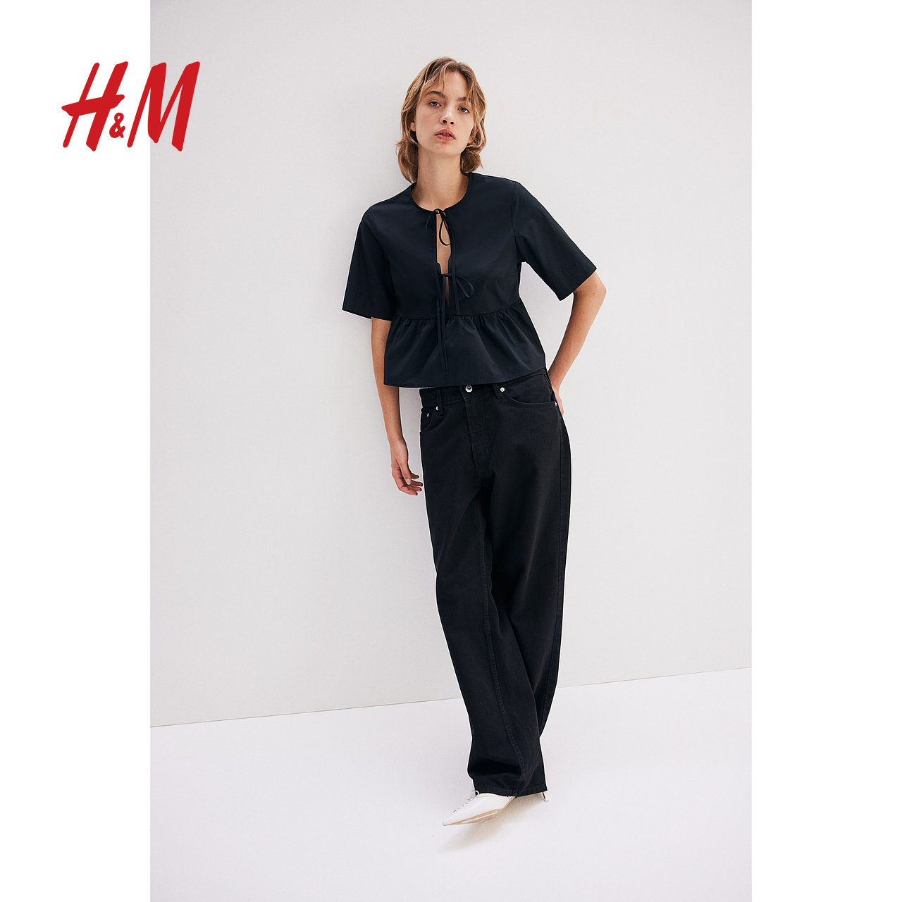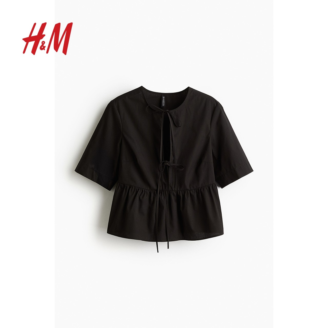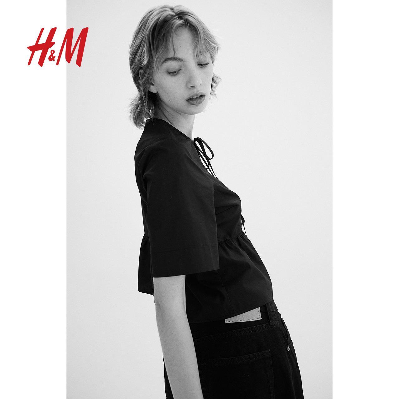 HM女装衬衫冬季时尚休闲正面系带府绸圆领上衣1202833