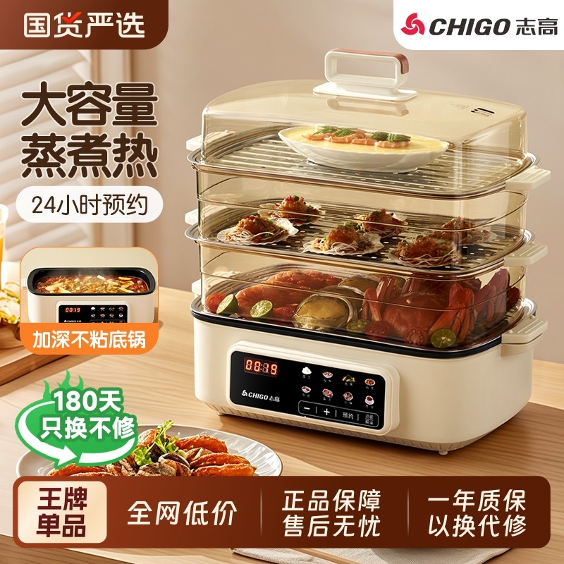 志高多功能电蒸锅家用蒸煮一体多层大容量电蒸箱早餐机三层不锈钢