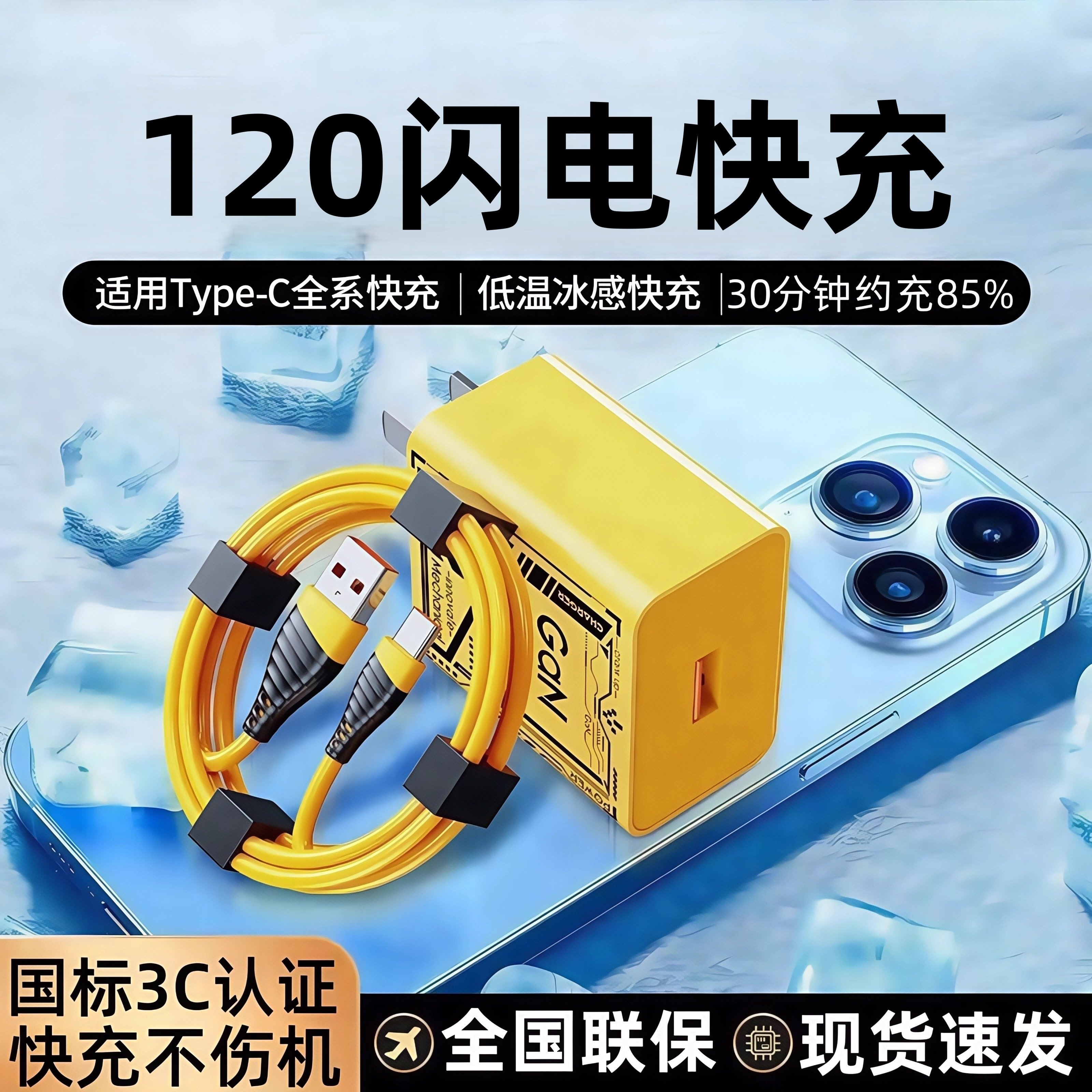 3C认证金色机甲风120氮化镓充电器闪电快充头安诗登适用华为苹果安卓vivo充电套装TypeC手机充电线快充套装