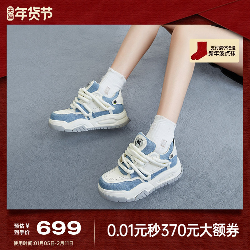 MIO米奥圆头中跟拼色休闲厚底板鞋街头酷感运动风时尚女鞋增高鞋