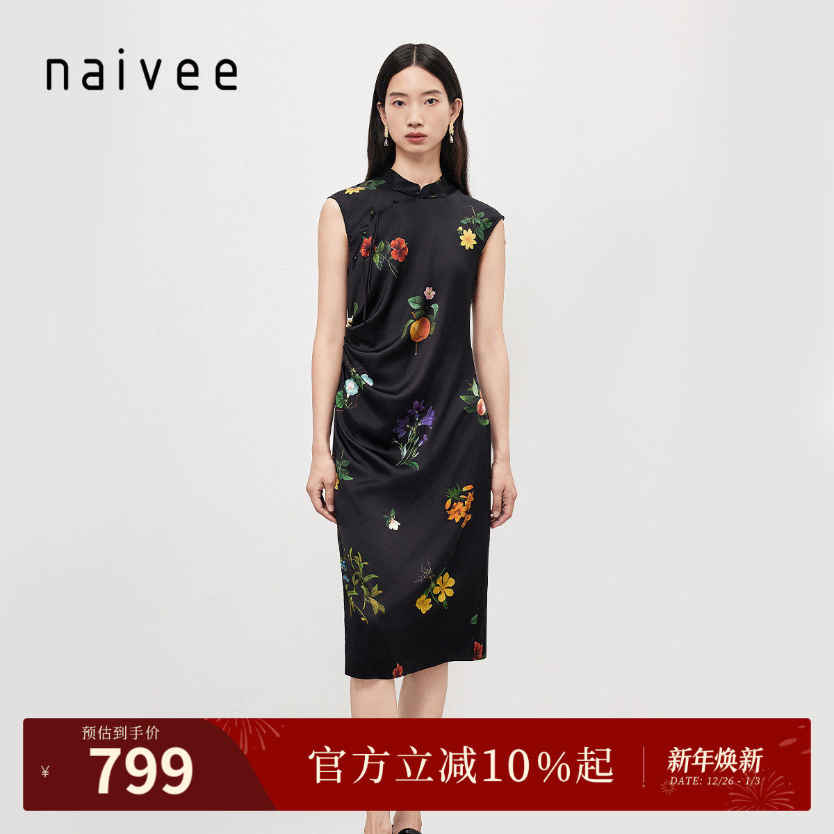 纳薇夏款旗袍女新中式立领斜襟真丝连衣裙收腰显瘦轻礼服裙子