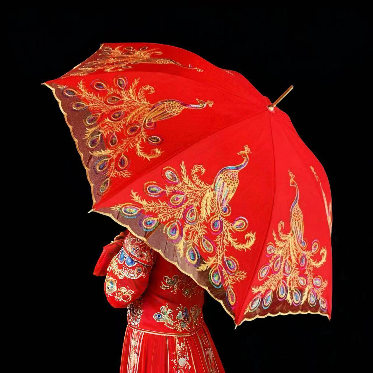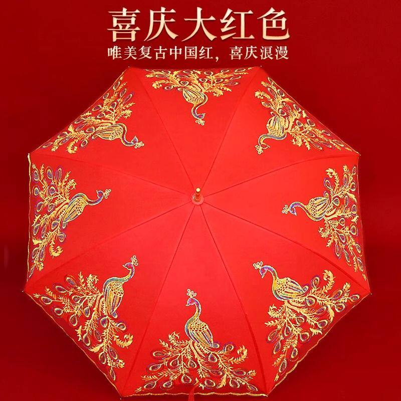 婚庆新娘伞红伞结婚用品红色雨伞长柄大红色订婚出嫁蕾丝花边红伞