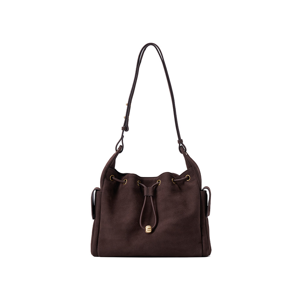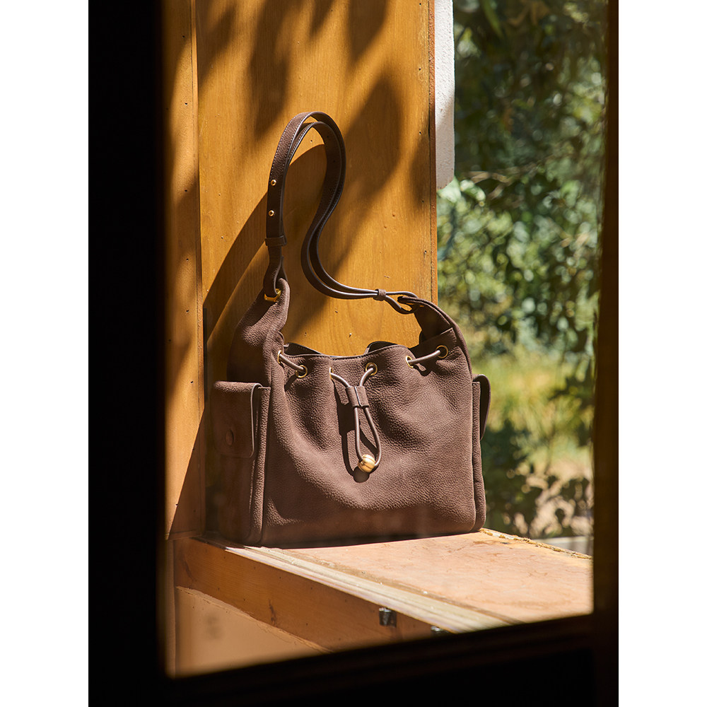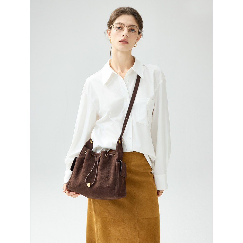 伊米妮头层牛皮复古磨砂皮洋气百搭手提小水桶包斜挎包抽绳单肩