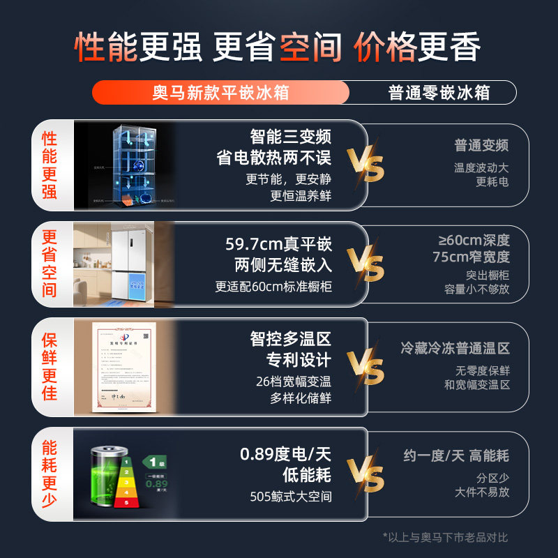 奥马505L冰箱零嵌入式以旧换新补贴家用双开门大容量一级能效无霜