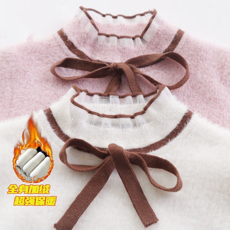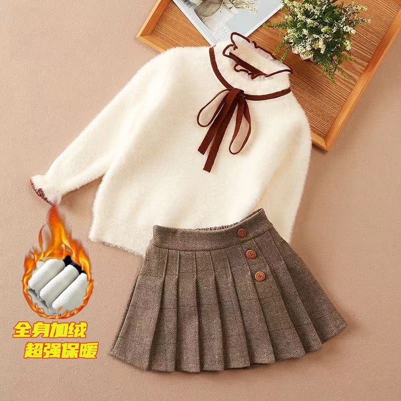 女童蝴蝶结秋冬装洋气毛衣套装儿童保暖水貂绒百褶裙两件套中大童