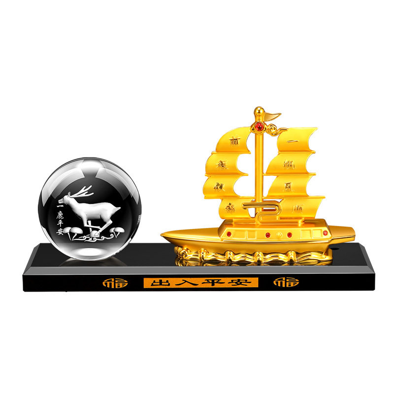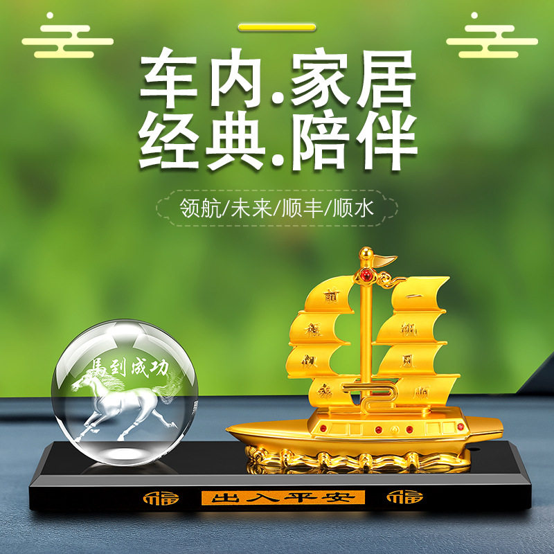 一帆风顺帆船汽车摆件车内装饰摆件合金船水晶内雕球马到成功香薰