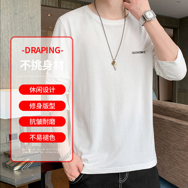 100%纯棉长袖男春秋薄款休闲运动百搭潮流大码上衣全棉圆领打底衫