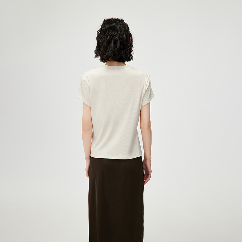 三福短袖T恤女2026新款夏季褶皱设计感修身圆领短款白色上衣女装