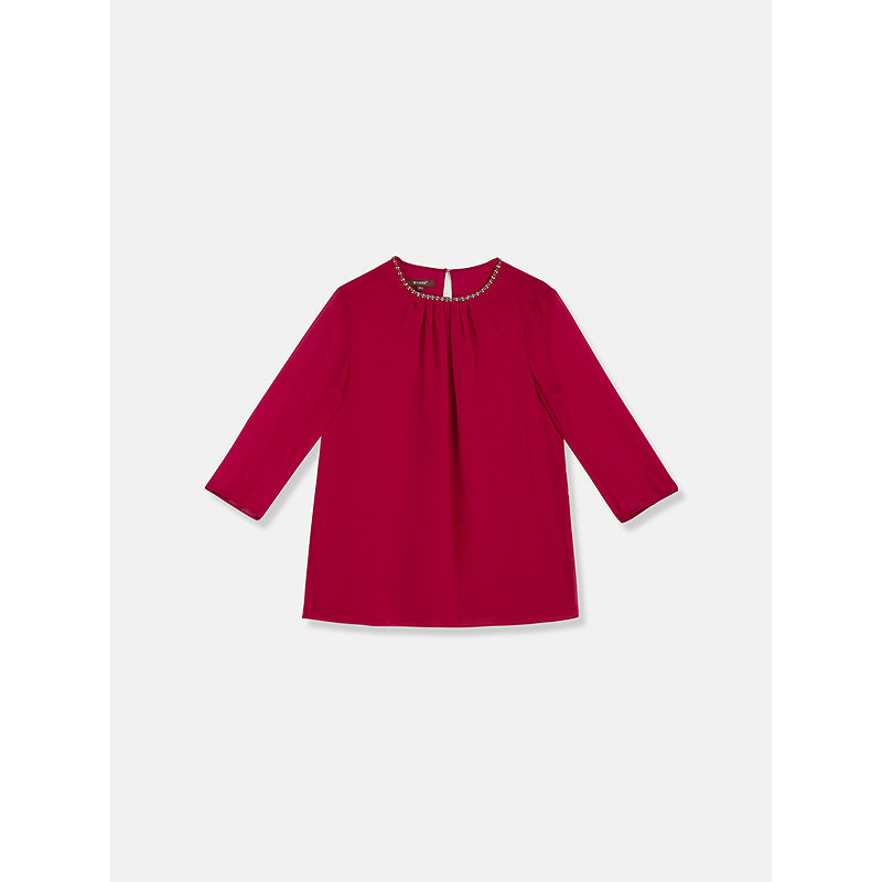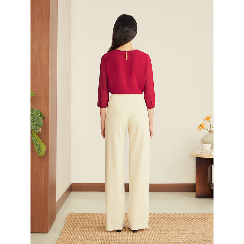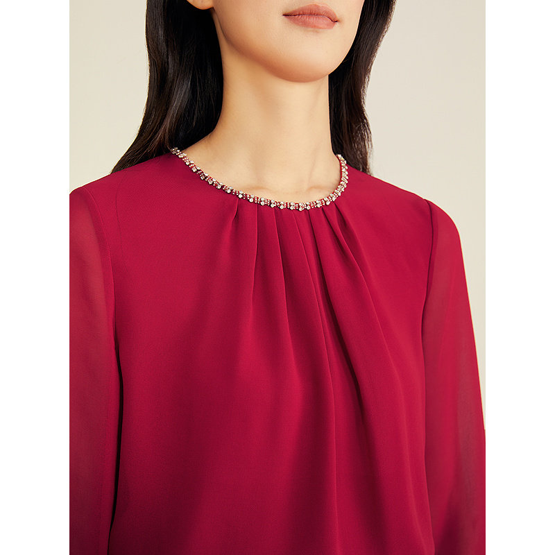 YINER音儿专选2025秋季新款法式优雅珠钻碎褶简约圆领雪纺衬衫