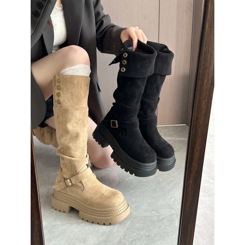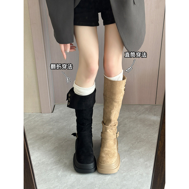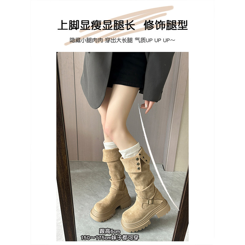 厚底增高绒面长筒靴子女2025新款西部牛仔高筒骑士靴修饰腿型中跟