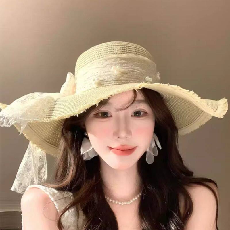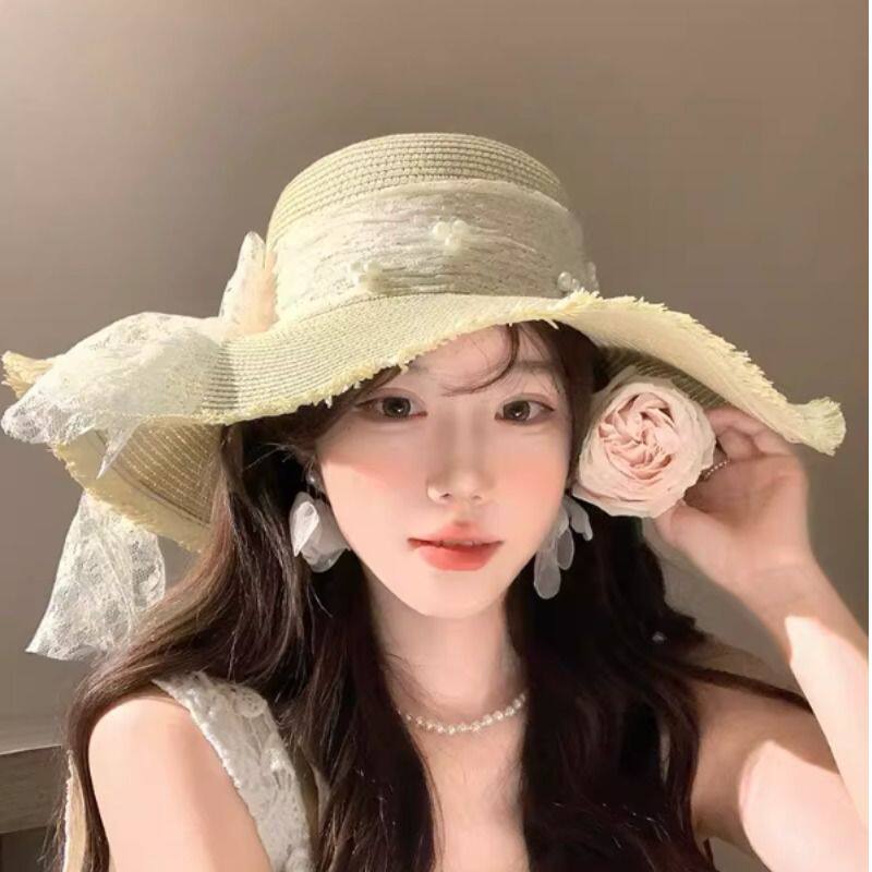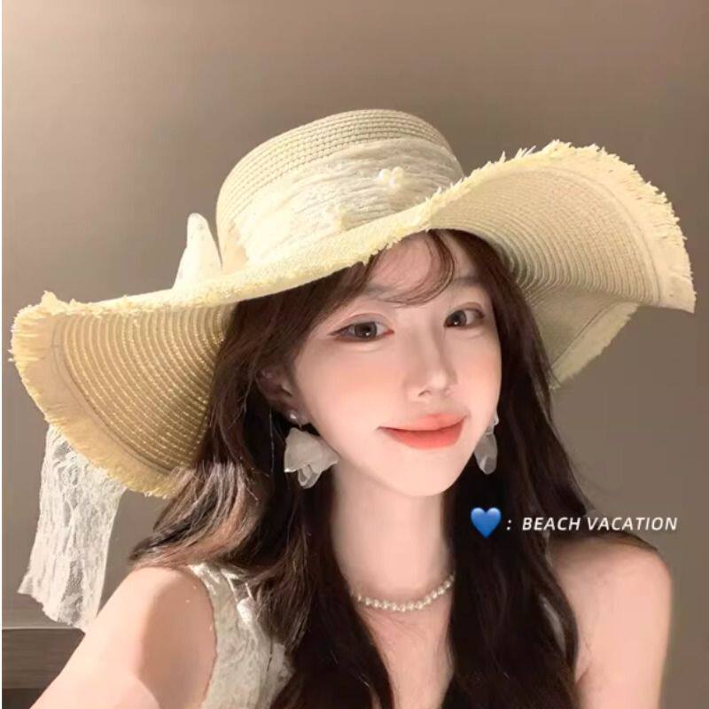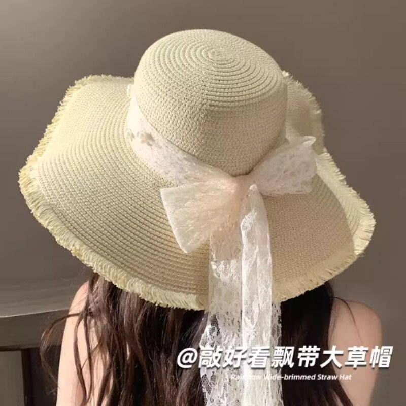 蕾丝蝴蝶结草帽女夏季海边沙滩度假遮阳防晒气质法式甜美太阳帽子