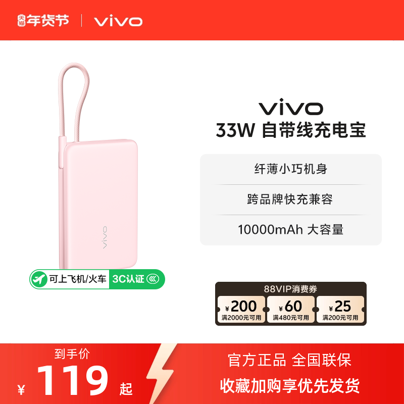 【 3C认证】vivo自带线充电宝10000毫安33W可上飞机大容量快充便携学生新品户外出行