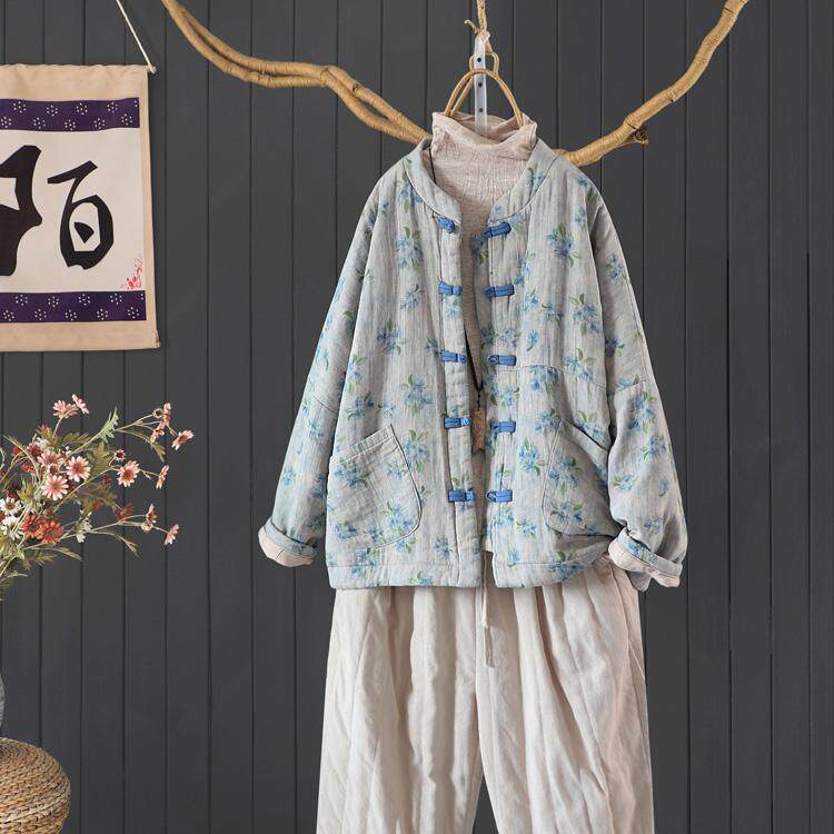 冬季复古国风印花盘扣夹棉加厚外套女宽松慵懒蝙蝠型碎花棉衣棉服