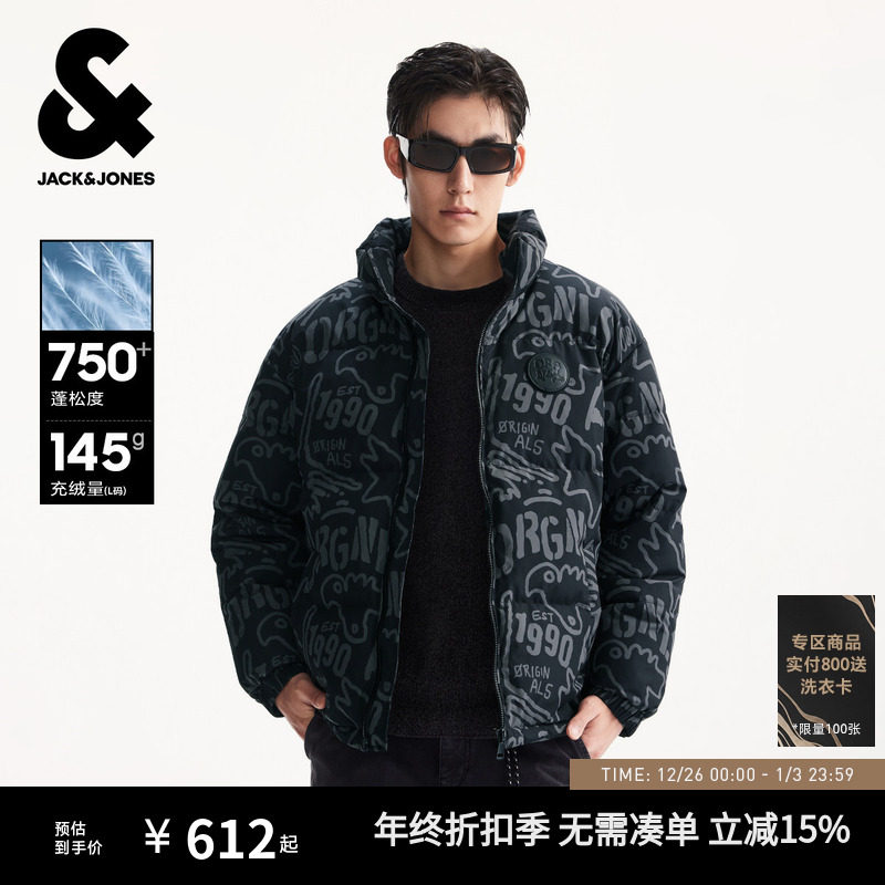 杰克琼斯短款排骨羽绒服男冬机能冰壳满印立领夹克外套面包服男装