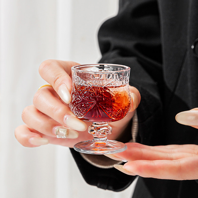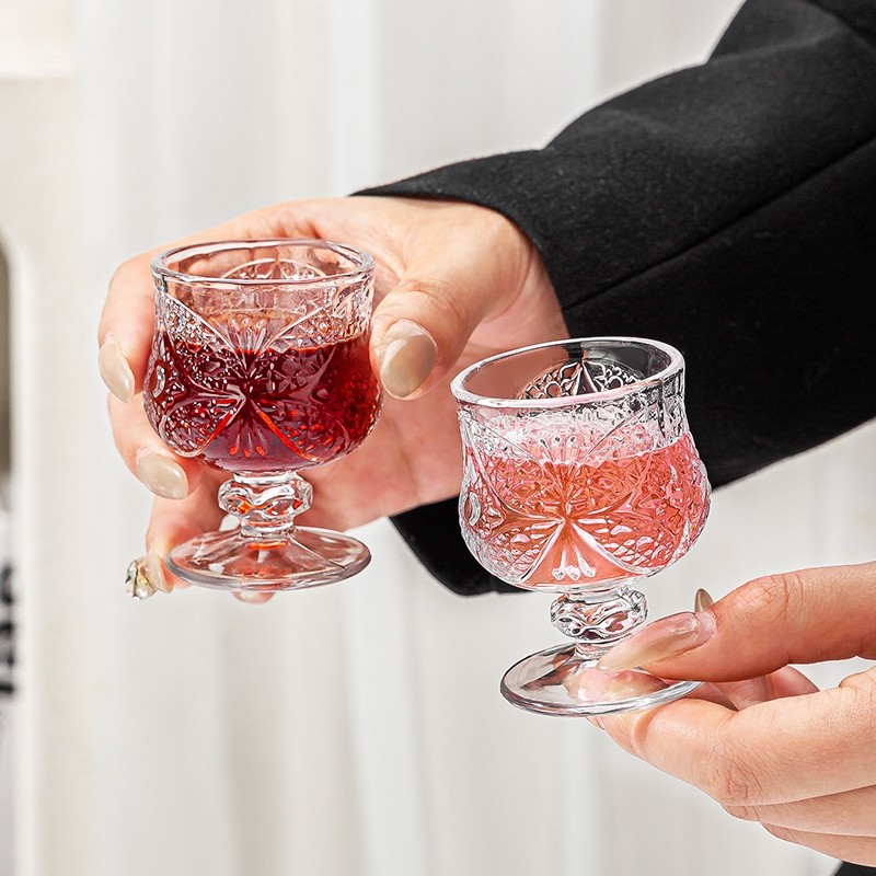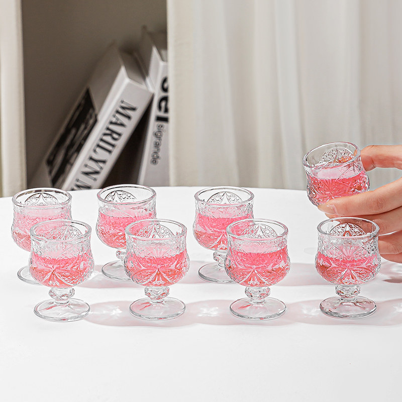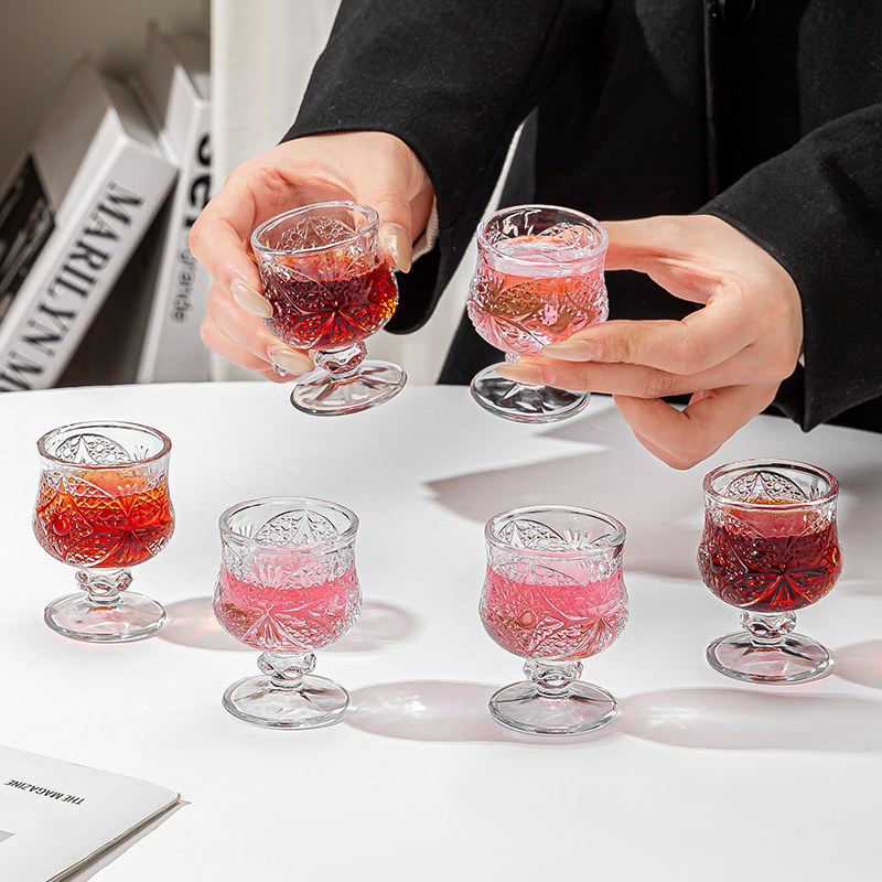复古刻花玻璃小酒杯一口杯白酒杯套装高颜值果酒杯迷你高脚甜酒杯