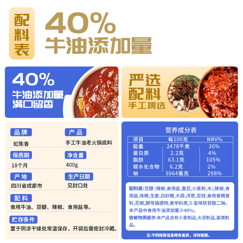 名扬虹陈香牛油火锅底料400g餐饮装麻辣香锅调料四川袋装小块冒菜