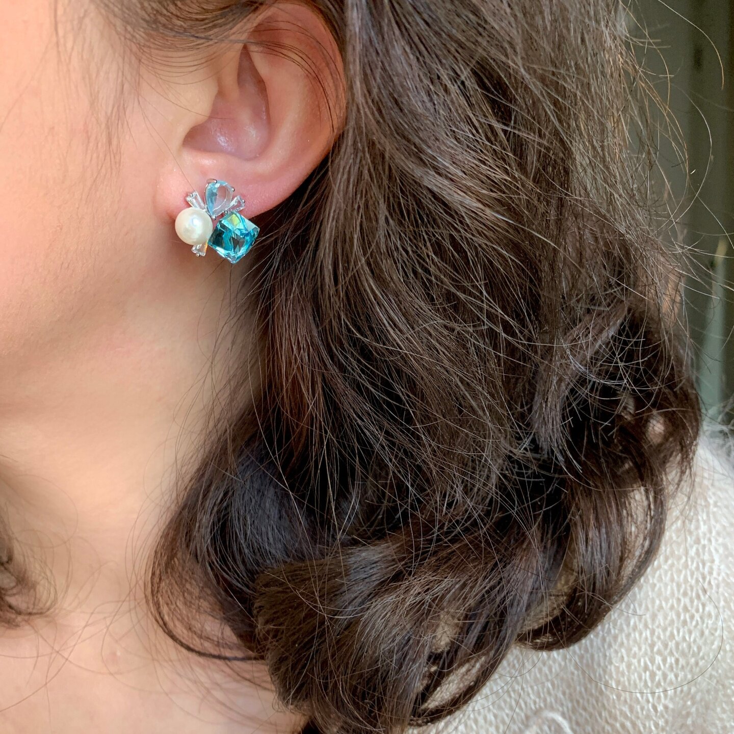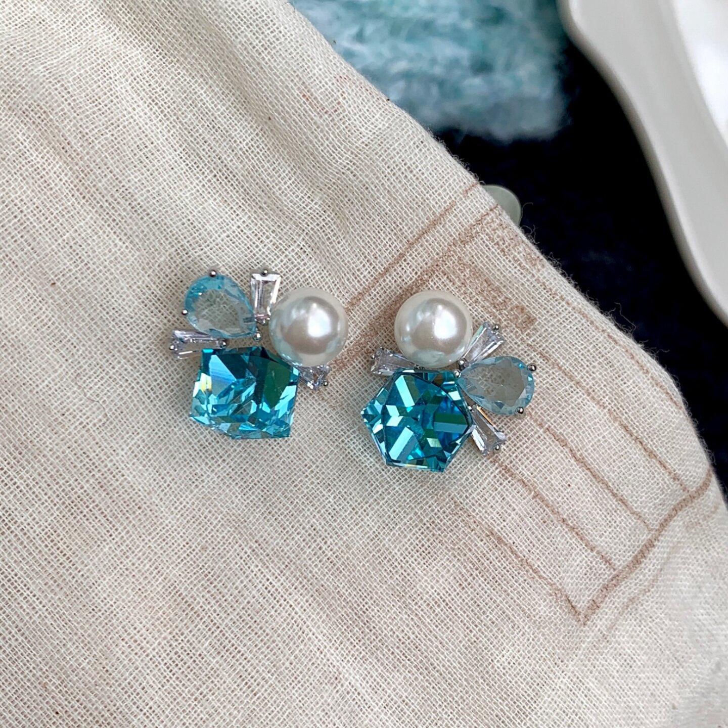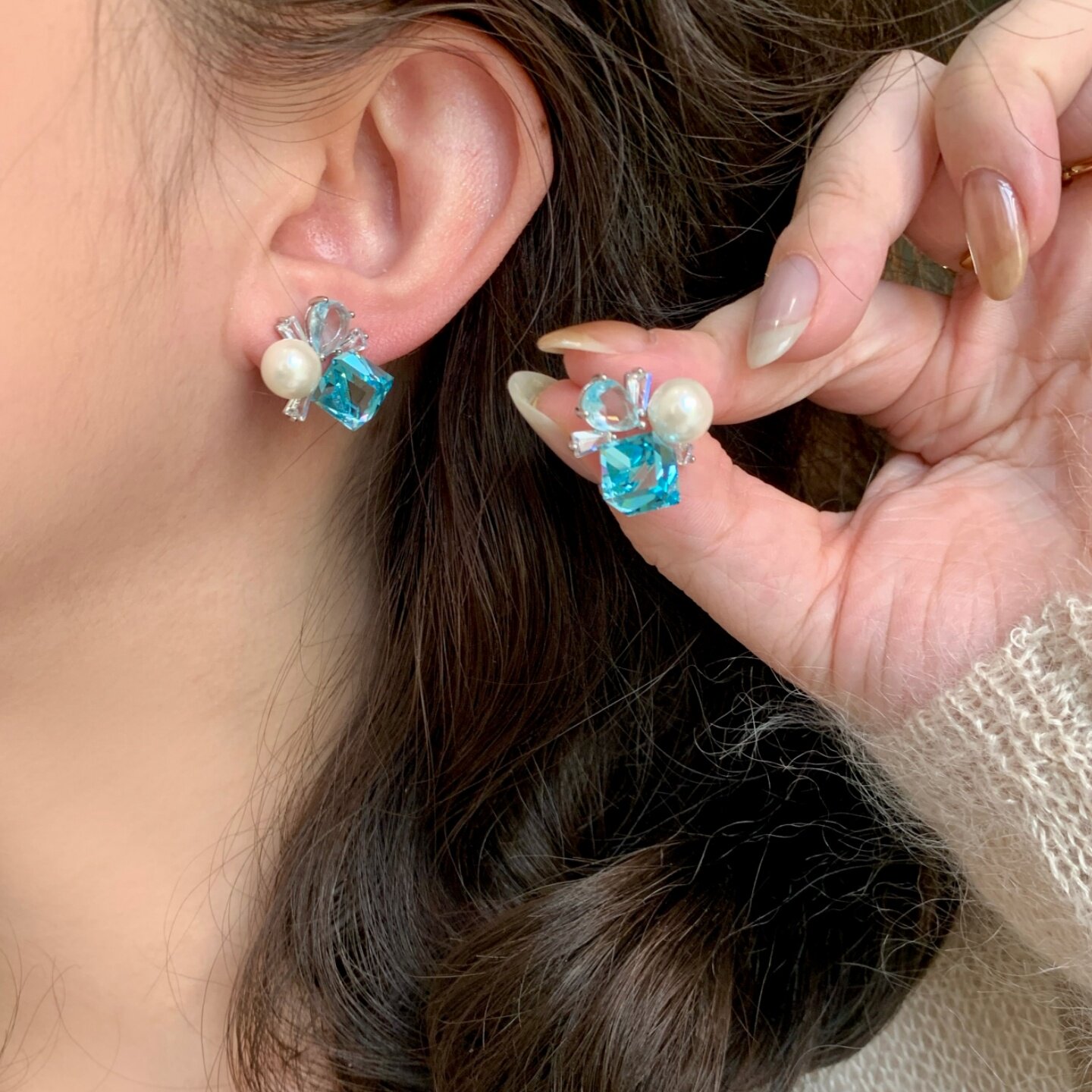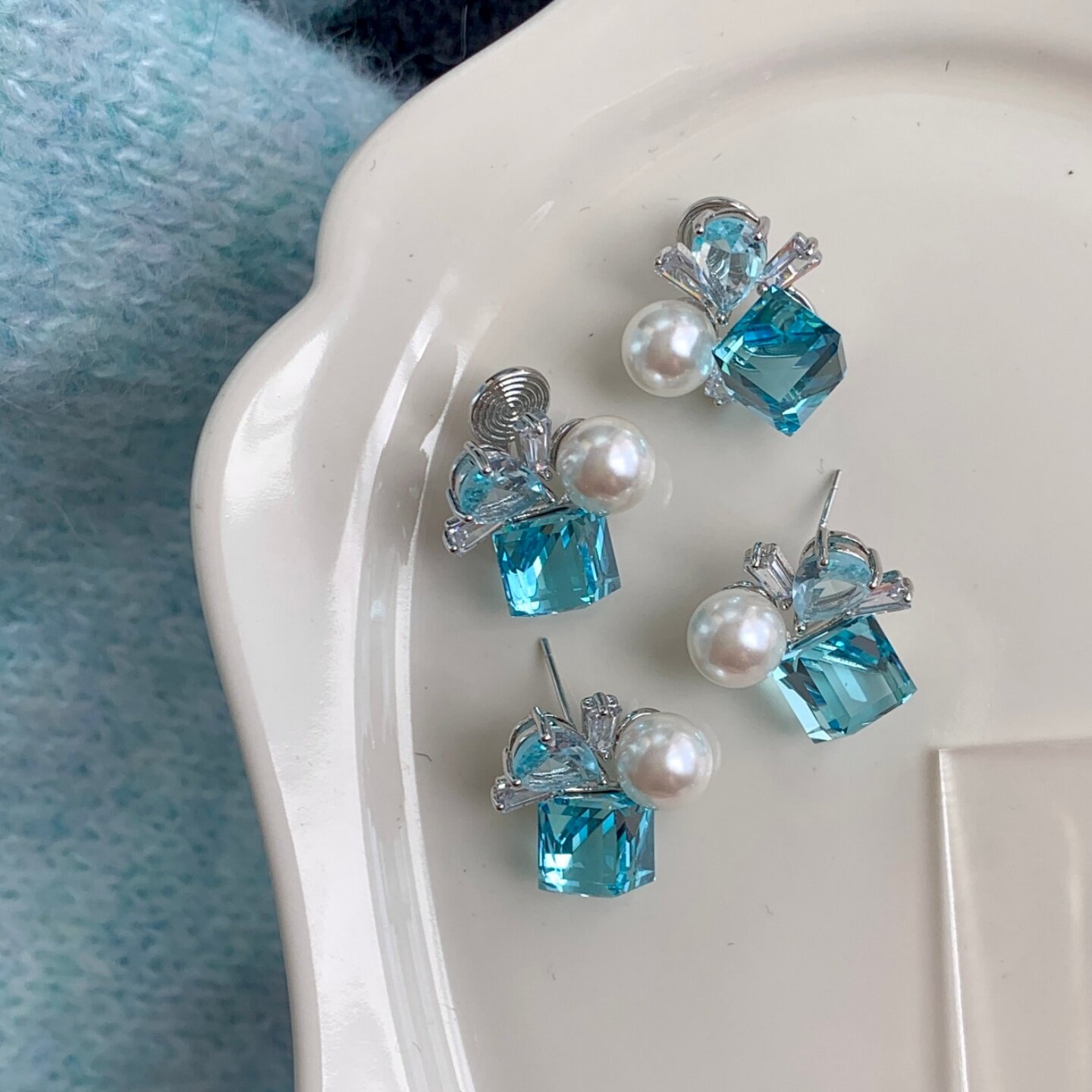 《阿伦戴尔》精致轻奢春夏仙气蓝色水晶珍珠方糖耳夹耳饰耳钉耳环